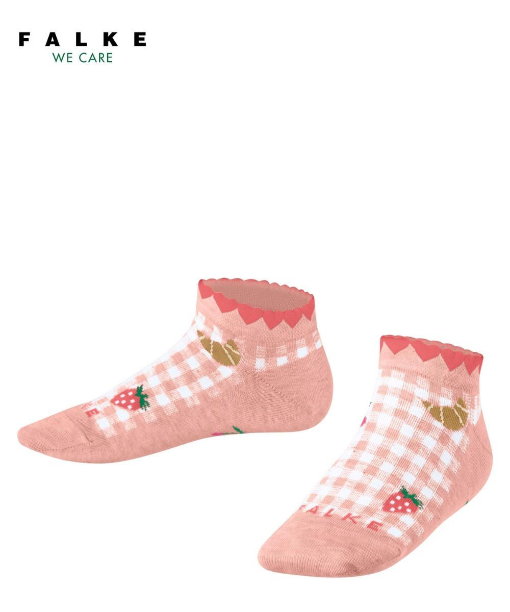 Die pastellrosa Farbe ist subtil und charmant, während die Spitze der Socken ein hübsches weißes und blassrosa Gingham-Muster trägt. Kleine Designs von roten und grünen Erdbeeren in der Nähe der Zehen sorgen für einen Hauch von Fröhlichkeit. Die Spitze an der Spitze der Socken ist mit abwechselnden Spitzen und Tälern in Rosa geschmückt, wodurch eine angenehme ästhetische Wirkung erzielt wird.