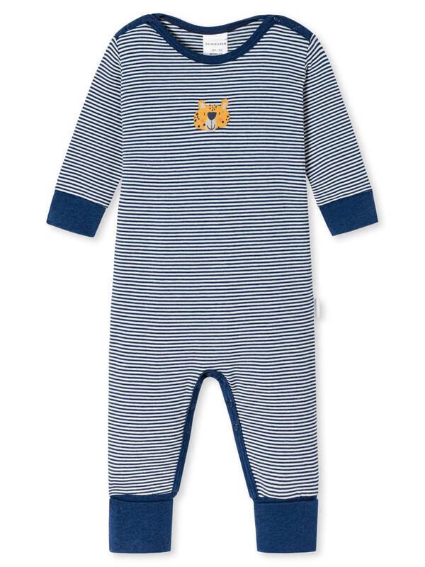 langer, geringelter Unisex-Baby-Schlafanzug in indigo mit Tiger-Motiv flexible Vario-Bündchen an den Beinen und Armen