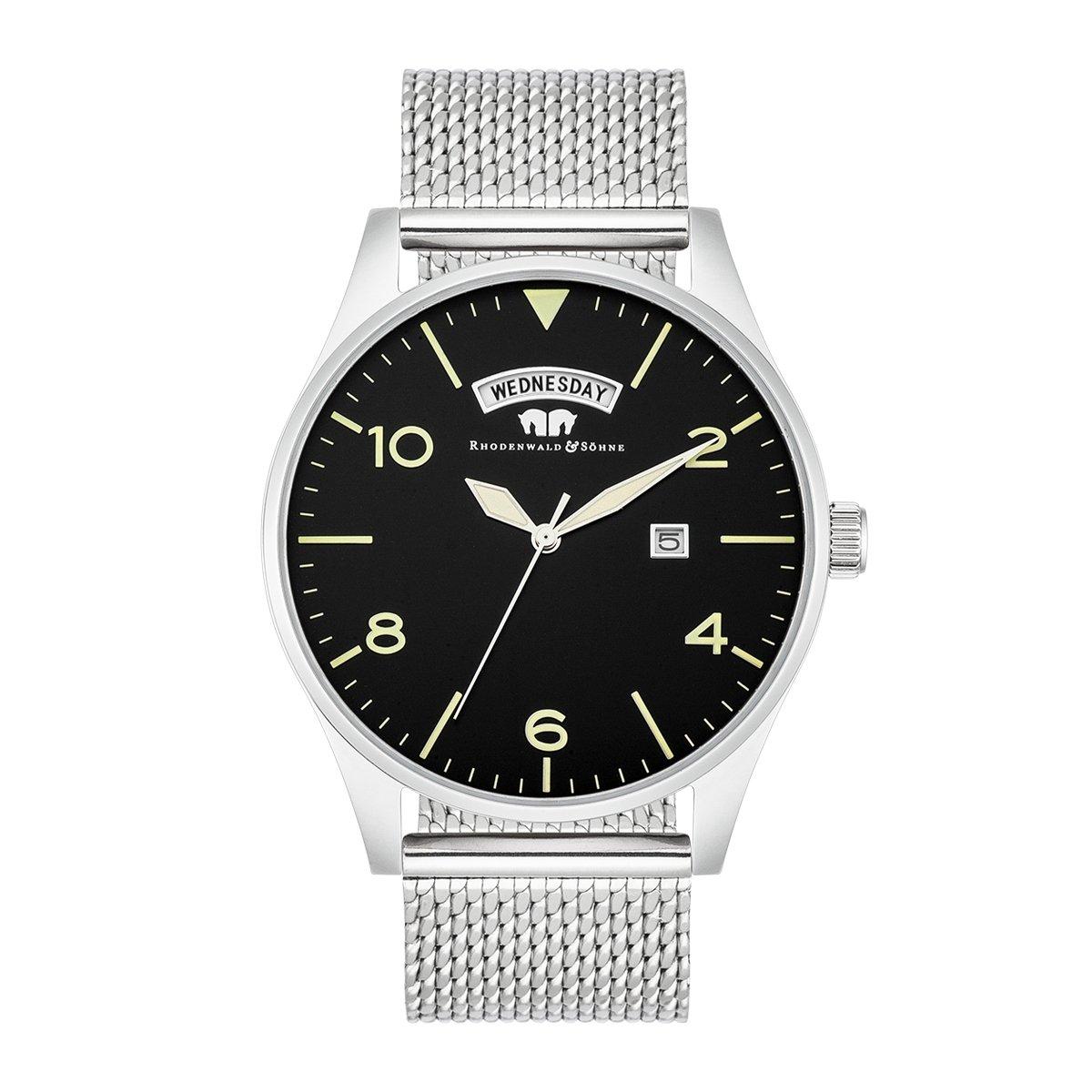 Weniger ist mehr: Nach diesem Motto wurde das Design dieser exklusiven Herrenuhr der Manufaktur Rhodenwald & Söhne entworfen. Reduziert auf Datums- und Wochentagsanzeige und schlichte Strichindices kombiniert mit arabischen Ziffern und Feuille-Zeigern überzeugt das Zifferblatt mit Minimalismus. Exquisiter Blickfang ist das aufwändige Milanaise-Armband mit Schiebeverschluss. Hinter der klassischen Uhrenoptik in der Tradition alter Uhrmacherkunst überzeugen moderne Materialien und eine zeitgemäße Technik: Gehäuse und Armband bestehen aus robustem Edelstahl. Hochwertiges Mineralglas und ein präzises Quarzuhrwerk runden die hochwertige Ausstattung ab.