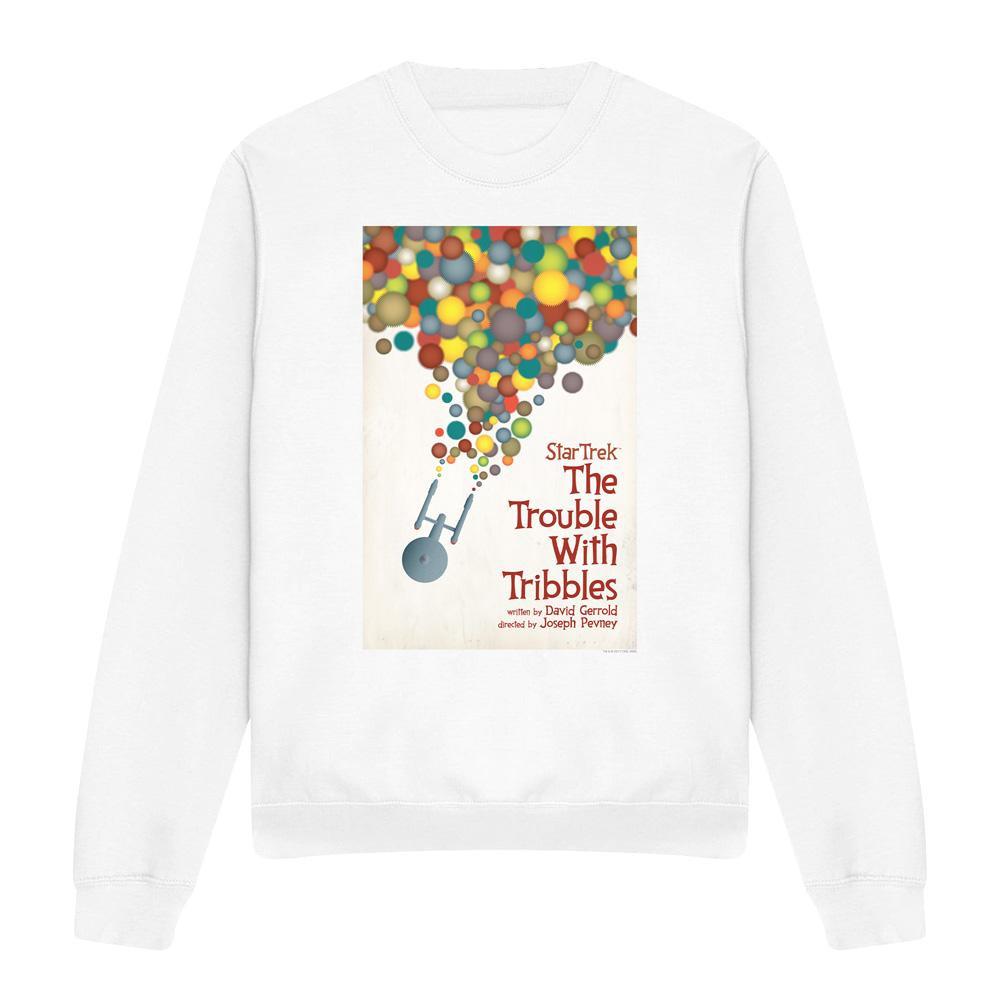 Dieses Sweatshirt zeigt einen grafischen Druck, inspiriert von der "The Trouble With Tribbles"-Episode aus Star Trek: The Original Series. Das Design präsentiert eine farbenfrohe Ansammlung von Tribbles, die aus einem Raumschiff der Sternenflotte strömen und die ikonische Bildsprache der klassischen Episode einfangen.