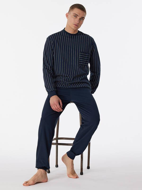 Dieser Pyjama kombiniert sportliche und maskuline Eleganz, perfekt zum Entspannen zu Hause. Das Set besteht aus einem gestreiften Rundhals-Oberteil mit aufgesetzter Brusttasche und einer langen, unifarbenen Hose mit Komfortbund.