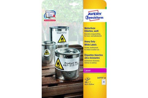 Die weissen, wetterfesten Etiketten L4773-20 im Format 63,5 x 33,9 mm für Laser-Drucker von AVERY ZWECKFORM zeichnen sich durch eine extreme Strapazierfähigkeit im Innen- und Aussenbereich aus. 480 matt beschichtete Folien-Etiketten aus Polyester auf 20 Bogen. Durch die starke, permanente Haftung eignen sie sich besonders zur wetterfesten und dauerhaften Kennzeichnung. Die reiss- und wasserfesten Folien-Etiketten sind deutlich strapazierfähiger als Papier-Etiketten, öl-, schmutz-, UV- und temperaturbeständig (-20° bis +80°C), reiss- und wasserfest und abwaschbar.Gestalten und drucken Sie Ihre wetterfesten Aufkleber schnell und einfach - mit den kostenlosen Avery Zweckform Etiketten-Vorlagen oder den im Microsoft® Office Paket integrierten Basis-Vorlagen. Geeignet für alle gängigen Laser-Drucker.Das klimaneutrale Unternehmen Avery Zweckform verwendet schon seit 2014 ausschliesslich Ökostrom/-gas. Forschung, Entwicklung, Produktion, Logistik und Verwaltung am Firmenstandort in Oberlaindern/Bayern garantieren höchste Qualitätsstandards, hohe Umweltvorgaben und kurze Lieferwege. Die Etiketten aus PVC-freier Folie werden klimaneutral hergestellt, die Emissionen des Materials werden kompensiert.