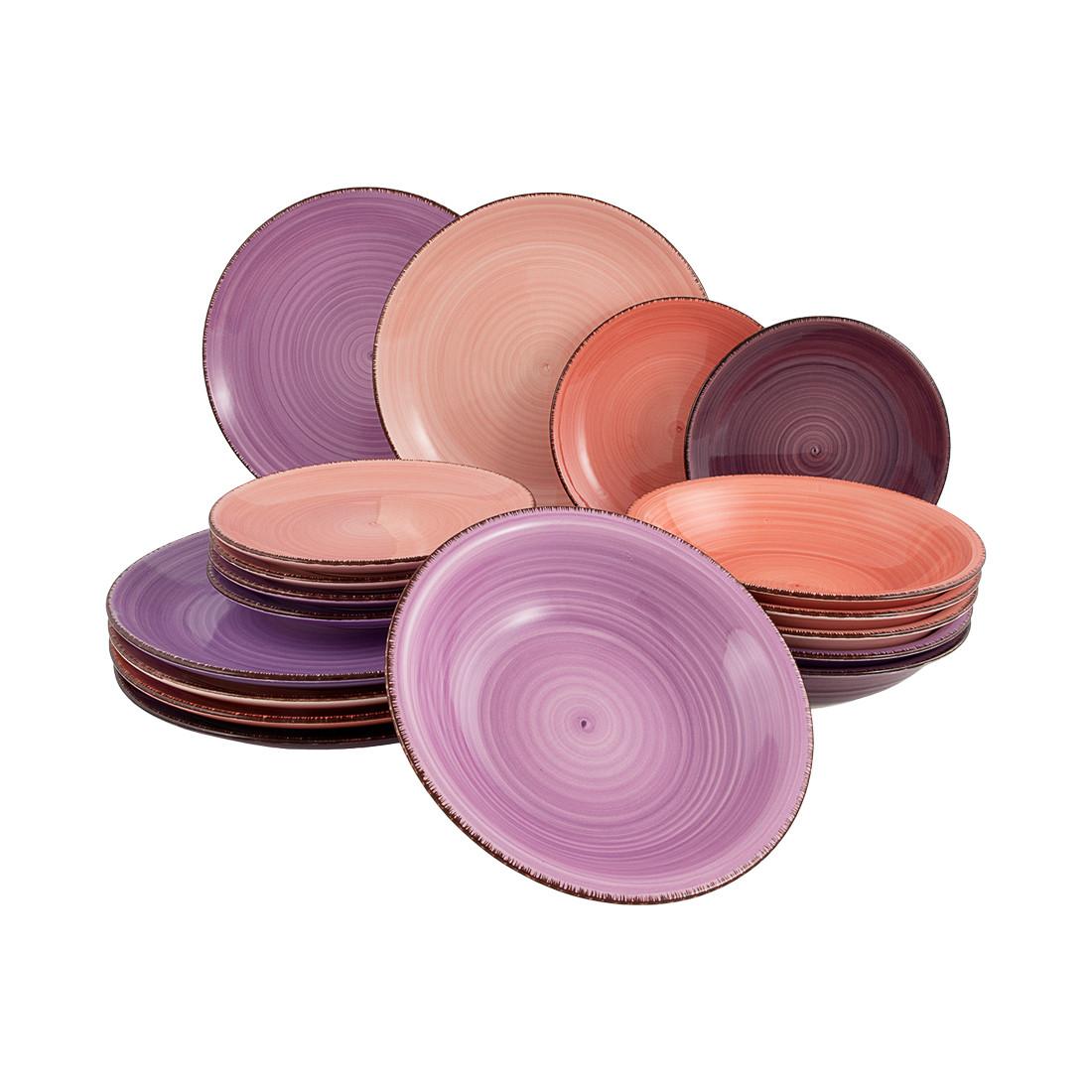 Produktinformation, Normale runde Form, Schöne Struktur an der Innen- und Aussenseite, Wunderschönes Design in Violett, 6x Essteller 26.5 cm, 6x Suppen-/Nudelteller 21 cm / 700 ml, 6x Frühstücksteller 19 cm