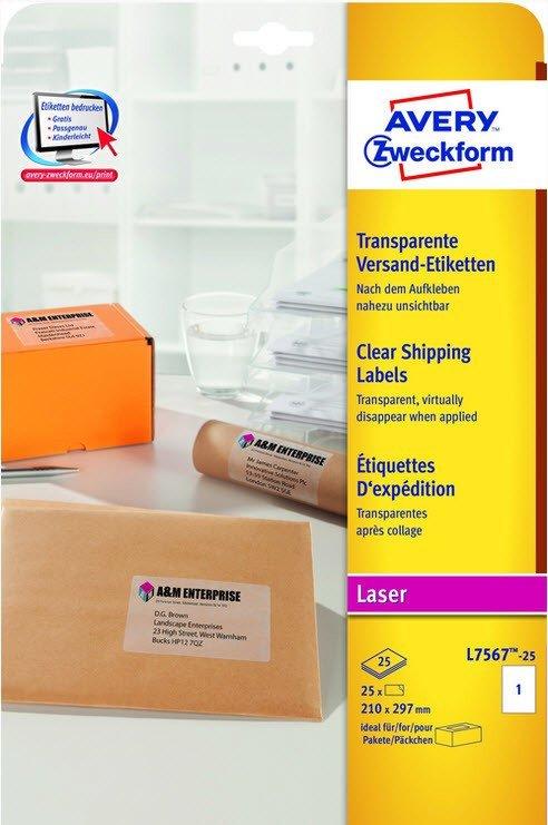Die transparenten Versand-Etiketten L7567-25 für Laser-Drucker im Format 210 x 297 mm von AVERY ZWECKFORM eignen sich z.B. zum Adressieren von Päckchen und Paketen. 25 Paketaufkleber auf 25 Bogen. Die transparenten Adressaufkleber aus Polyester-Folie sind nach dem Aufkleben nahezu unsichtbar, optimal für helle Verpackungen, die Adresse wirkt dadurch wie auf das Paket gedruckt. Sie können sich auf einen absolut staufreien Druckerdurchlauf ohne Klebstoffablagerungen im Drucker verlassen. Gestalten und drucken Sie Ihre Paketaufkleber schnell und einfach - mit den kostenlosen Avery Zweckform Etiketten-Vorlagen und Software-Lösungen oder den im Microsoft® Office Paket integrierten Basis-Vorlagen. Einfaches Abziehen und Aufkleben mit der einzigartigen QuickPEEL-Abziehhilfe. Geeignet für alle gängigen Laser-Drucker. Das klimaneutrale Unternehmen Avery Zweckform verwendet schon seit 2014 ausschliesslich Ökostrom/-gas. Forschung, Entwicklung, Produktion, Logistik und Verwaltung am Firmenstandort in Oberlaindern/Bayern garantieren höchste Qualitätsstandards, hohe Umweltvorgaben und kurze Lieferwege. Die Etiketten aus PVC-freier Folie werden CO2 neutral hergestellt, die Emissionen des Materials werden kompensiert.