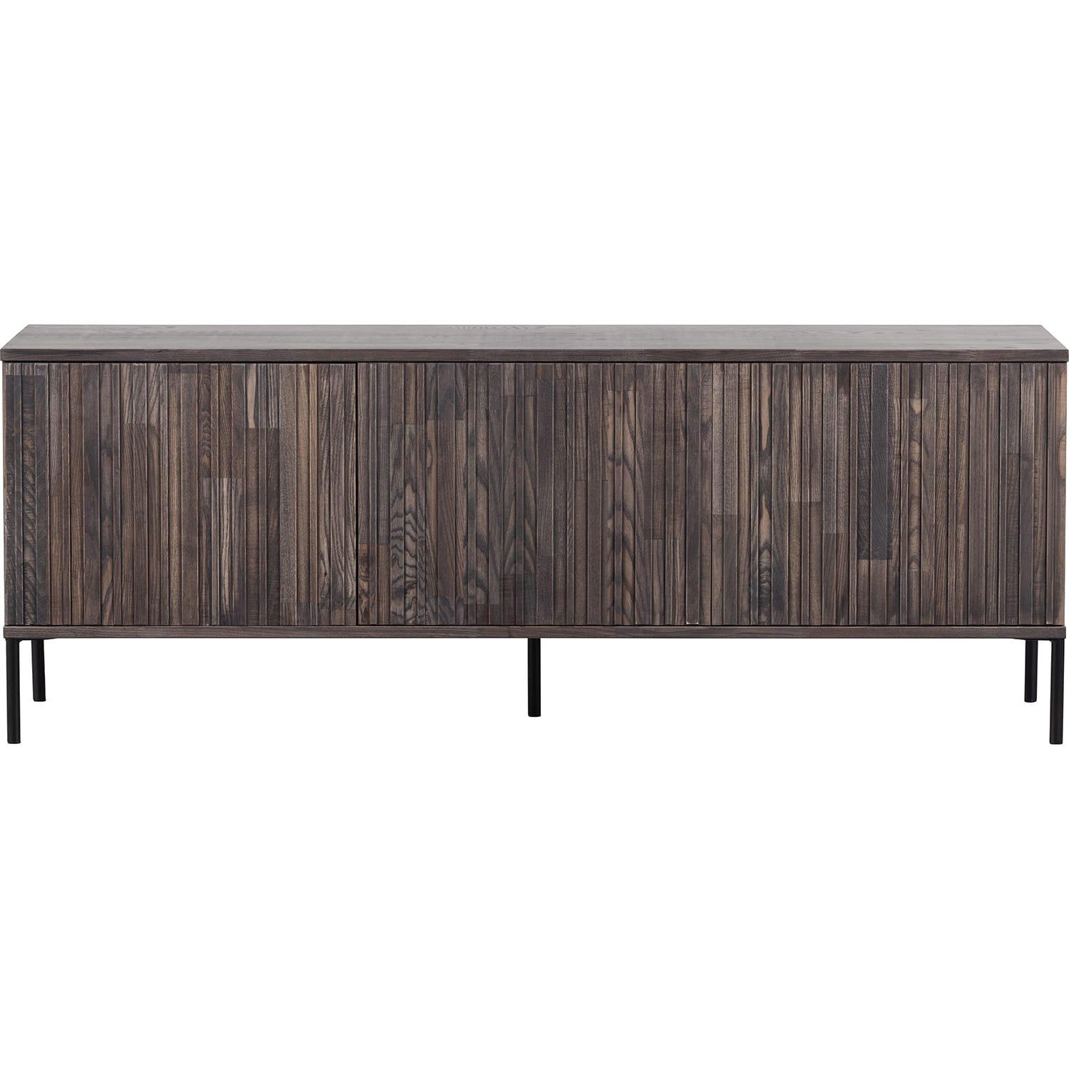 MaterialDer TV-Schrank New Gravure ist aus Eschenholz gefertigt und mit einer warmen braunen, espressofarbenen Beize versehen. Das Innere ist aus schwarzer Spanplatte gefertigt. Die Beine sind aus Metall mit einer schwarzen Beschichtung. Esche ist ein leicht weiches Holz mit einer geraden Maserung. Aufgrund der geraden Maserung lässt sich Eschenholz gut biegen und eignet sich daher sehr gut für die Möbelindustrie. Behandeltes Eschenholz ist stark und widerstandsfähig, aber unbehandeltes Eschenholz kann sich stark bewegen und schnell vergilben. Geschliffene Esche sorgt für ein sauberes, glattes Aussehen. Gebürstete Esche hat mehr Charakter, und bandgesägte Esche sieht sehr robust und rau aus.AbmessungenDer TV-Schrank New Gravure ist 56 cm hoch, 150 cm breit und 44 cm tief. Die drei Türen sind jeweils 37 cm hoch, 50 cm breit und 2 cm dick. Das Linienmuster auf den grifflosen Türfronten verleiht dem Schrank sein attraktives, wiedererkennbares Aussehen. Das Möbel verfügt über drei herausnehmbare Einlegeböden, die auch in der Höhe verstellbar sind. Die Regale bilden sechs Fächer mit den Massen 18x50x42 cm (Höhe x Breite x Tiefe). Die Metallbeine sind 15 cm hoch und haben einen Durchmesser (ø) von 2 cm. Hinter jeder Tür wird ein Kreis für die Verkabelung ausgefräst (ø 50 cm), dieser ist 40 cm hoch über dem Boden.PflegeBehandelte Esche ist mit einem leicht feuchten, sauberen Tuch leicht zu reinigen. Flecken auf unbehandeltem Eschenholz lassen sich mit einem saugfähigen, s