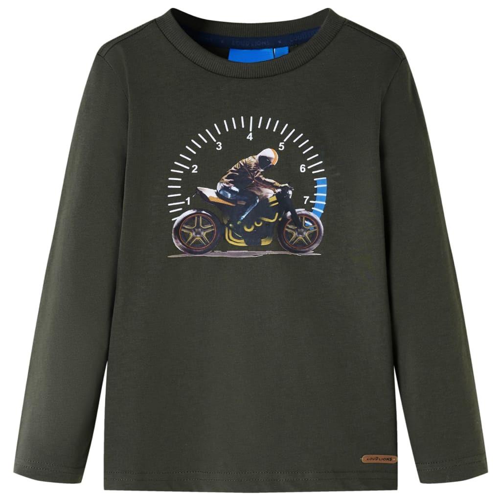 Dieses Kinder-T-Shirt hat lange Ärmel, einen Rundhalsausschnitt und eine gerade Passform. Das T-Shirt in Khaki ist mit einem Mann auf einem Motorrad bedruckt. Das Langarmshirt besteht zu 100 % aus Baumwolle, die mit einer Silikon- und Enzym-Waschung behandelt wurde und sich daher ganz weich und angenehm anfühlt.