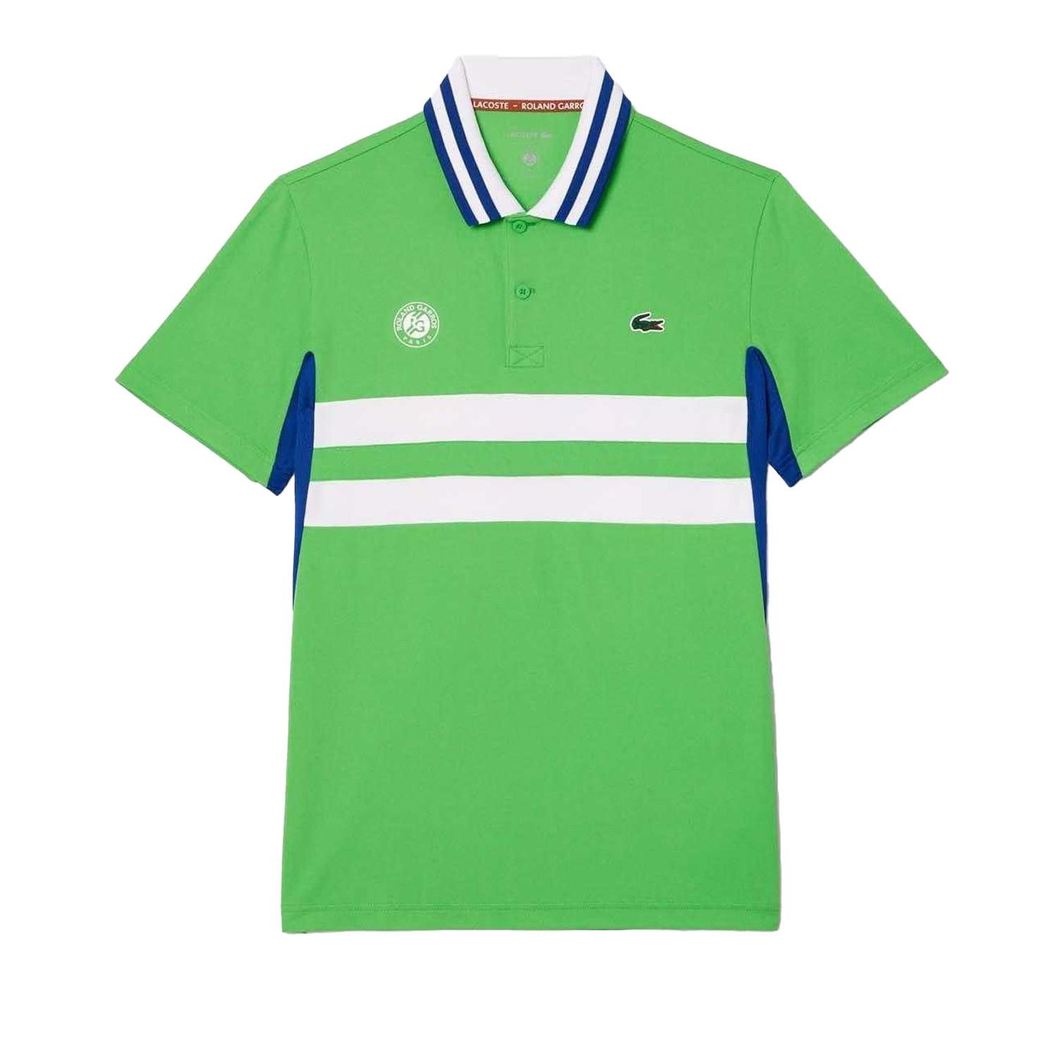 Das Shirt ist mit einem unverwechselbaren Branding versehen, einschliesslich des ikonischen Krokodil-Logos und des Roland Garros Emblems, was seinen Sondereditionsstatus kennzeichnet. Seitenpaneele in einer Kontrastfarbe verleihen einen dynamischen Touch, während horizontale Streifen auf Brust und Rücken seinen sportlichen Reiz verstärken.
