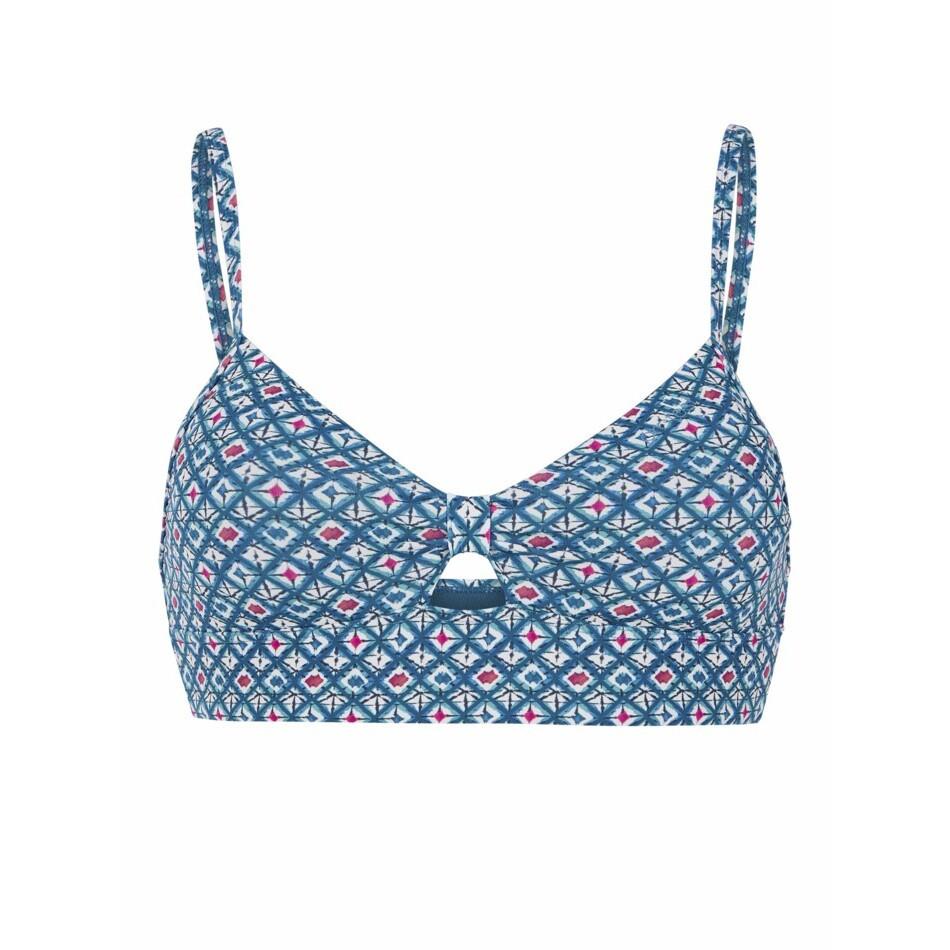 Dieses Bikini-Oberteil präsentiert ein lebhaftes geometrisches Muster und bietet einen stilvollen Look für Bademode. Das Design umfasst ein geknotetes Detail an der Vorderseite, das einen subtilen Cut-out-Effekt erzeugt. Es ist mit verstellbaren Schulterträgern für eine personalisierte Passform und Komfort ausgestattet.