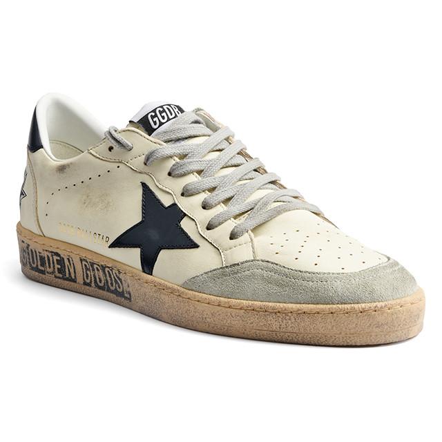Die Ballstar sind Leder- und Samtleder Sneaker, mit einem eleganten und raffinierten Design. Die Hauptfarbe ist weiß, ergänzt durch Berührungen von Grau und Creme. Ein schwarzes sternförmiges Emblem ist an den Seiten sichtbar und verleiht den Schuhen einen Hauch von Stil. Die Schnürsenkel sind klar, während das Etikett des Tabs die Initialen "GGDB" trägt. Die Unterseite der Schuhe verfügt über Perforationen zur Verbesserung der Belüftung und des Fußkomforts.