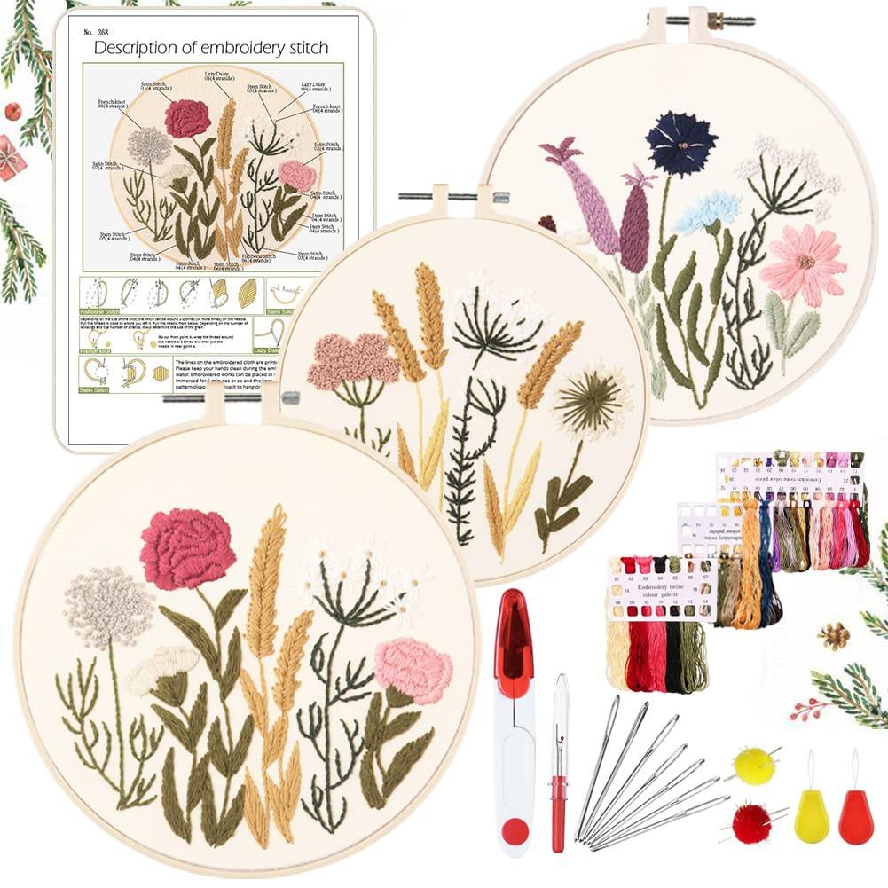 Activity-board Anfänger Stickerei Kit Stickerei Kit, floral Design Pflanzen Kreuzstich Kit Starter Tools Kit mit 3 Stück Kunststoff-Stickrahmen, für DIY Kunst, Handwerk