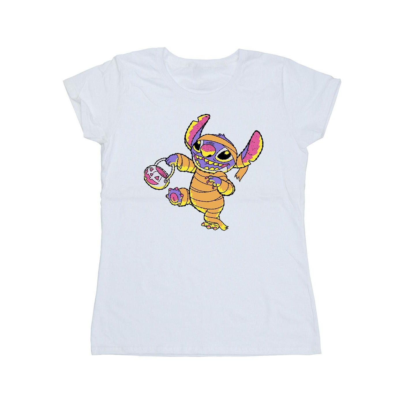 Dieses T-Shirt zeigt eine verspielte Grafik von Stitch, der als Mumie verkleidet ist und bereit für "Süsses oder Saures" ist. Die lebendigen Farben des Drucks heben sich vom klassischen weissen Hintergrund ab und machen es zu einem lustigen und auffälligen Kleidungsstück für jeden lässigen Anlass.