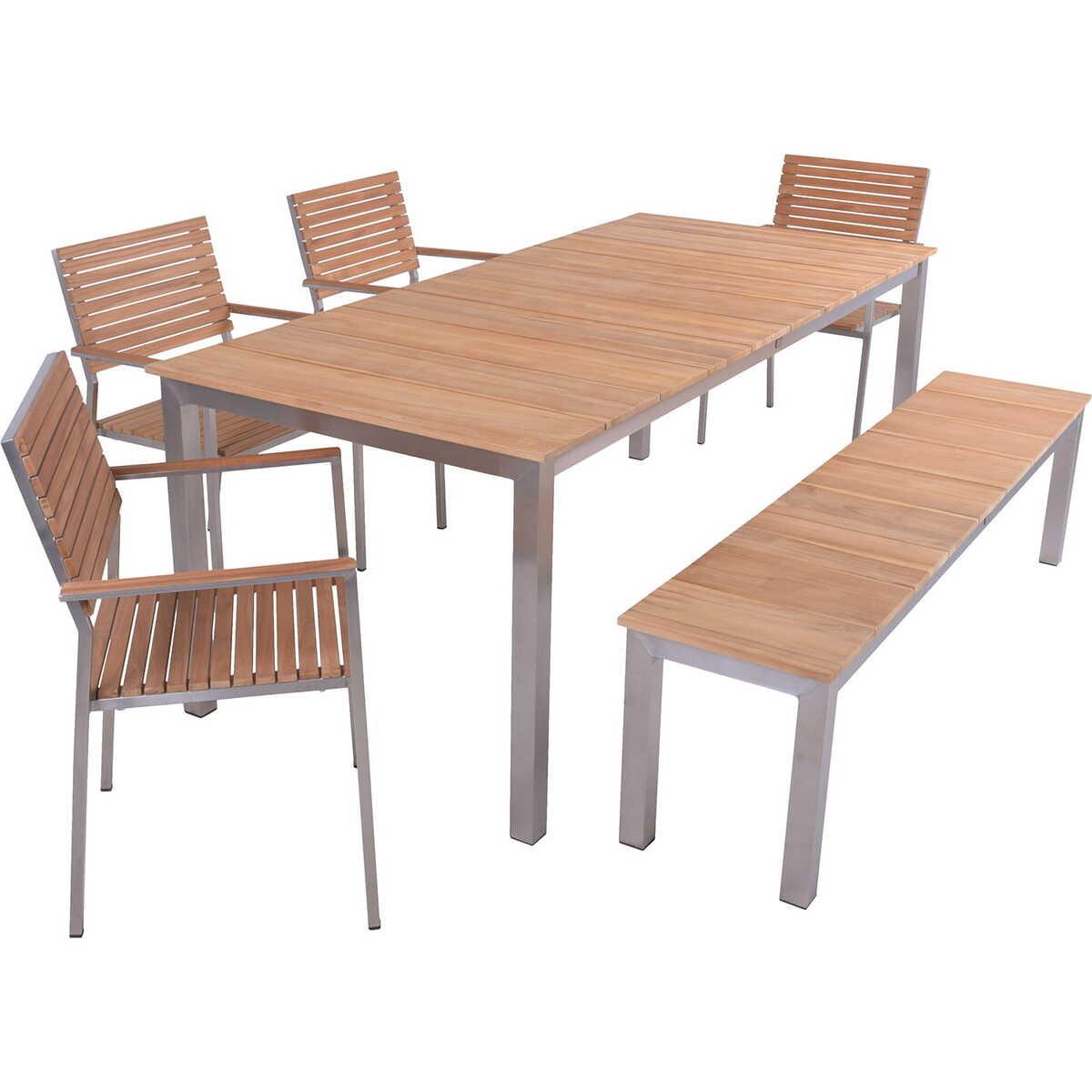 Hergestellt aus robustem Edelstahl und geöltem Teakholz Set beinhaltet Tisch, Bank und vier Stühle Schwarze PE-Fusskappen für zusätzlichen Schutz Rückenlehnenfreie Bank für flexible Sitzmöglichkeiten Wetterbeständige Materialien für den langfristigen Ausseneinsatz Tischgruppe bietet viel Platz für Familie und Freunde Elegantes Design ergänzt jede Outdoor-Wohnlandschaft Belastbarkeit: Bank 180 kg, Stuhl 100 kg, Tisch 60 kg