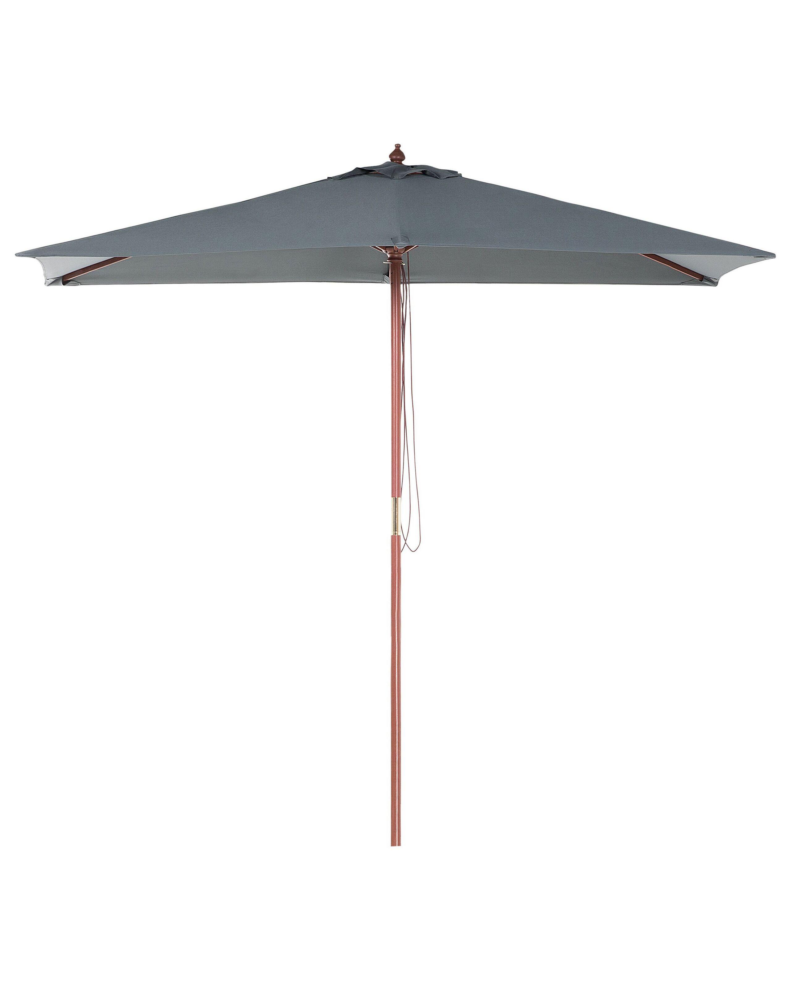 Rechteckiger Sonnenschirm in Dunkelgrau . Dieser Sonnenschirm liegt voll im Trend. Die Kombination mit dem wunderschönen, stabilen Birkenholz in einem warmen Braunton verleiht dem Sonnenschirm ein natürliches, sommerlich frisches Flair. 6 robuste Streben und ein praktisches Winddach gewährleisten eine hohe Standfestigkeit. Der Bezug ist aus strapazierfähigem, UV-beständigem, schmutzabweisendem und wasserdichtem Polyester in Dunkelgrau gefertigt. Der Schirm lässt sich zudem mit einem Seilzug leicht öffnen und schliessen.