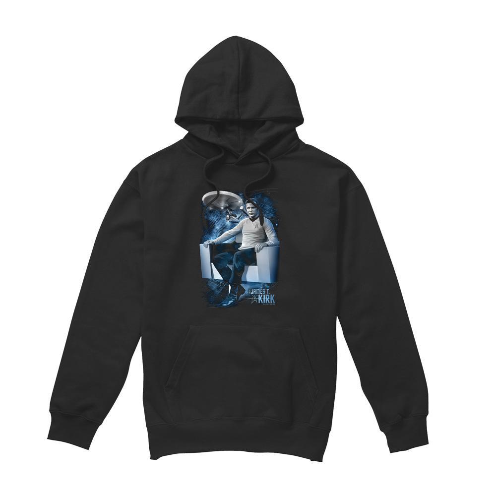 Dieser Kapuzenpullover zeigt einen auffälligen Grafikdruck von Captain Kirk in seinem ikonischen Captain's Chair und ist ein Muss für Fans. Das Design fängt einen klassischen Moment ein und bringt einen Hauch von Science-Fiction-Abenteuer in den Alltag.
