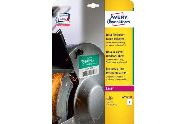Die weissen, ultra-resistenten Folien-Etiketten L7916-10 im Format 210 x 148 mm von AVERY ZWECKFORM zeichnen sich durch eine hohe Strapazierfähigkeit für höchste Beanspruchungen im Innen- und Aussenraum aus. 20 matt beschichtete Folien-Etiketten aus dehnfähigem Polyethylen auf 10 Bogen. Durch die starke, permanente Haftung auch auf schwierigen Oberflächen, eignen sie sich besonders zur Kennzeichnung in der Produktion und im Lager, zur Eigentumskennzeichnung, Beschriftung von Containern oder zur Beschilderung. Die seewasserfesten Folien-Etiketten sind ultra-widerstandsfähig, wasser- und wetterfest, öl-, schmutz-, UV- und temperaturbeständig (-40° bis +150°C). Zudem sind die abwaschbaren und alterungsbeständigen Etiketten resistent gegen viele Lösungs- und Reinigungsmittel. Gestalten und drucken Sie Ihre Aufkleber schnell und einfach - mit den kostenlosen Avery Zweckform Etiketten-Vorlagenoder den im Microsoft® Office Paket integrierten Basis-Vorlagen. Geeignet für alle gängigen Laser-Drucker. Das klimaneutrale Unternehmen Avery Zweckform verwendet schon seit 2014 ausschliesslich Ökostrom/-gas. Forschung, Entwicklung, Produktion, Logistik und Verwaltung am Firmenstandort in Oberlaindern/Bayern garantieren höchste Qualitätsstandards, hohe Umweltvorgaben und kurze Lieferwege. Die Etiketten aus PVC-freier Folie werden klimaneutral hergestellt, die Emissionen des Materials werden kompensiert. Made in Germany.
