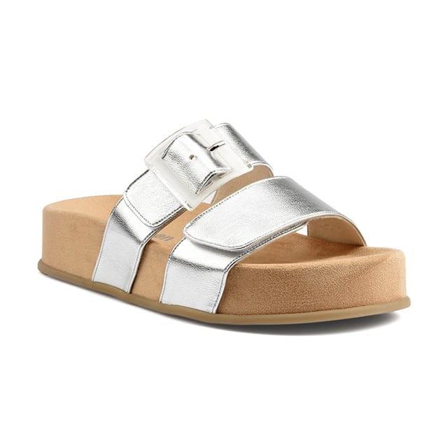 Diese Mules sind lässige und bequeme Schuhe für Ausflüge und Alltagskleidung. Hergestellt aus synthetischem Material, verfügen sie über ein elegantes Design mit zwei breiten Streifen, die über die Oberseite des Fusses kreuzen und durch transparente Kunststoffschnallen befestigt werden. Ein Band wird auf den mittleren Bereich des Fusses gelegt, während das andere einen Teil der Zehen bedeckt. Die Innensohlen sind mit Samtleder gefüttert, um optimalen Komfort zu bieten. Die Laufsohlen sind aus Gummi gefertigt und bieten aussergewöhnliche Leichtigkeit und Flexibilität. Diese Mules sind in Silber erhältlich, eine Farbe, die perfekt für Sommertage ist.