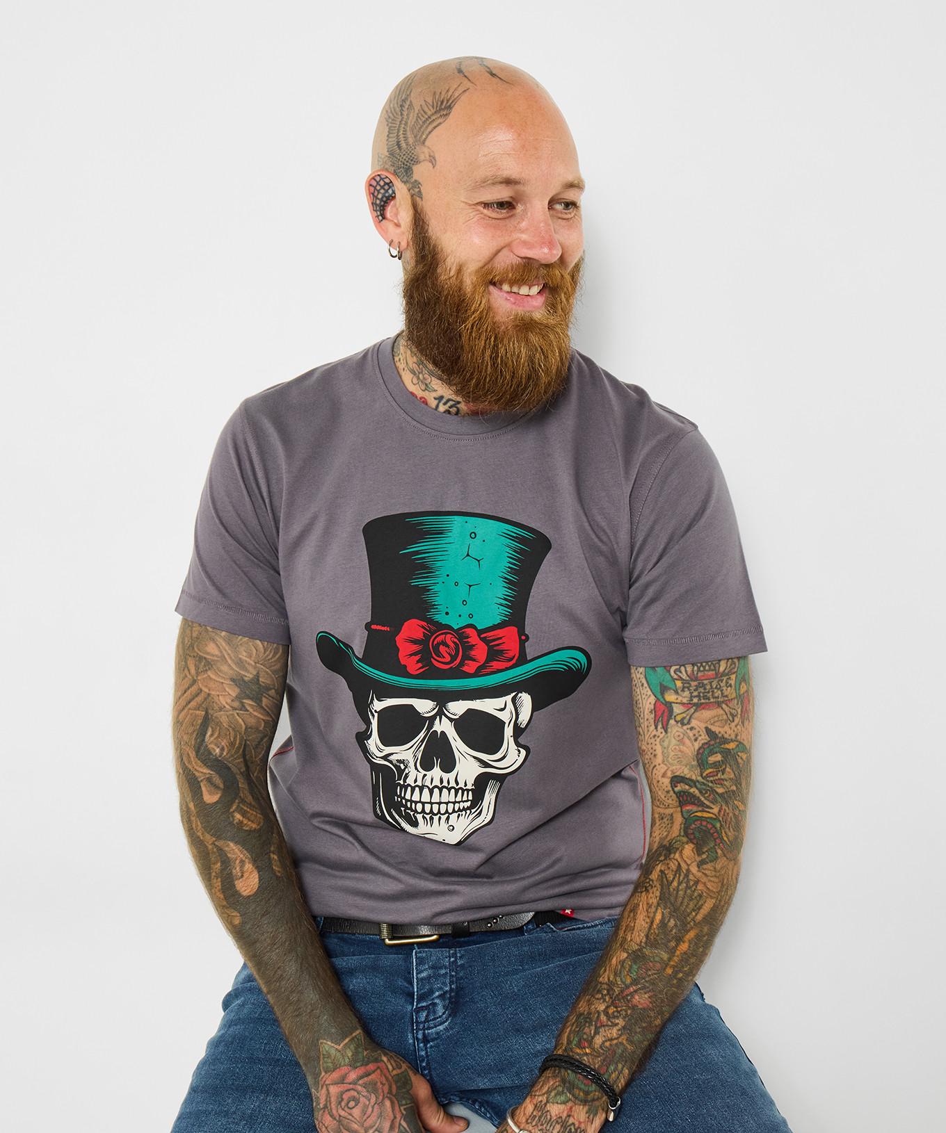 Dieses T-Shirt zeigt einen todschicken Gentleman, der jedes Outfit rockt. Es verfügt über einen unverwechselbaren Grafikdruck eines Schädels mit Zylinder, der einen einzigartigen und ausgefallenen Stil bietet. Das Design ist auf der Vorderseite zentriert und macht es zu einem Blickfang des Kleidungsstücks. Es ist ein vielseitiges Stück, das in verschiedene Freizeitoutfits integriert werden kann.