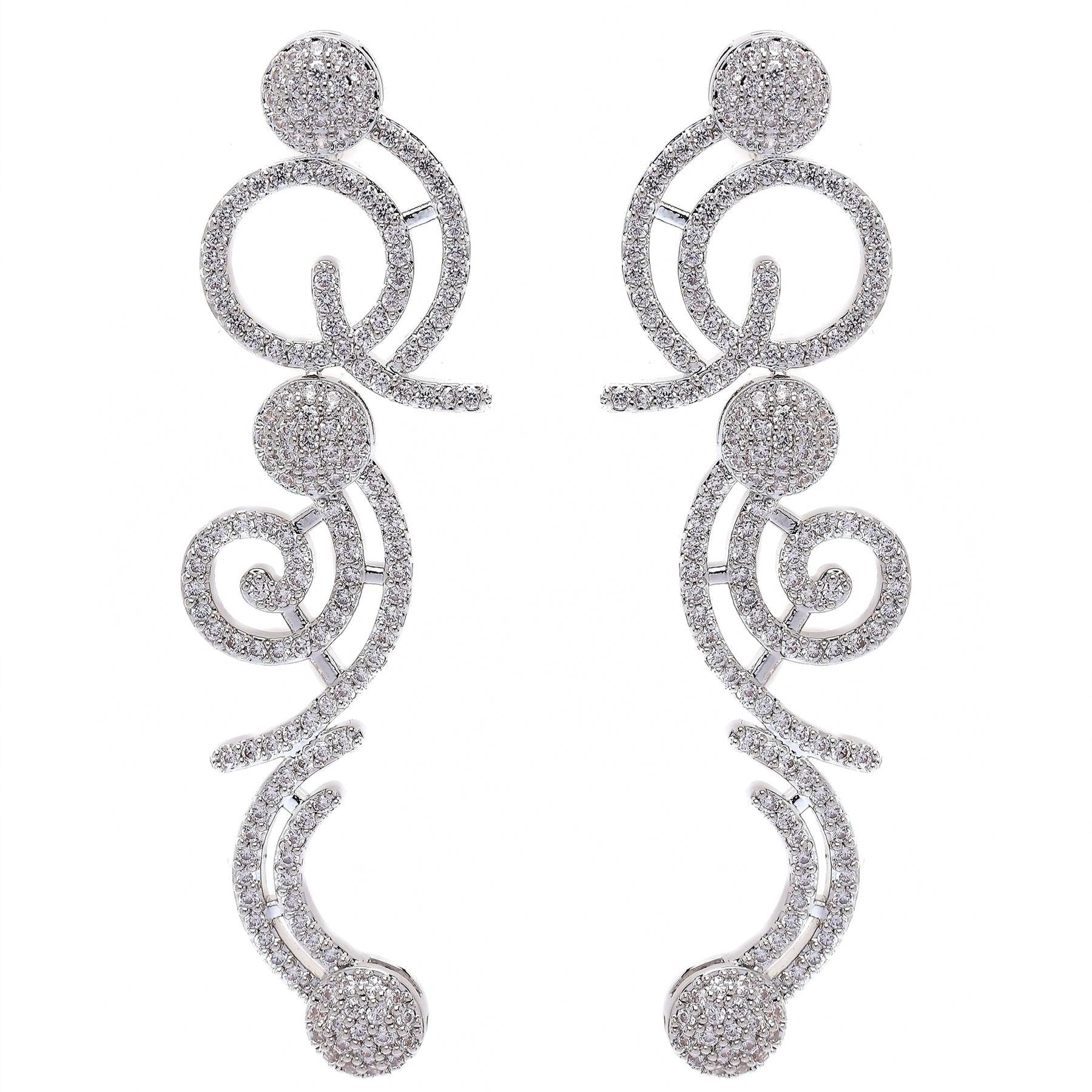 Setzen Sie ein funkelndes Statement mit diesen eleganten silbernen Spiralohrringen. Das filigrane Spiralmuster, besetzt mit schimmernden Kristallen, verleiht diesen Ohrringen Eleganz und Charme. Ihre anmutige, fließende Form sorgt für einen Hauch von Glamour und macht sie zum perfekten Accessoire für besondere Anlässe oder um Ihrem Alltagslook einen Hauch von Glanz zu verleihen. Größe: 1,5 cm x 5,6 cm | Beschichtung: Rhodiumplattiert | Verschluss: Stecker und Rückseite