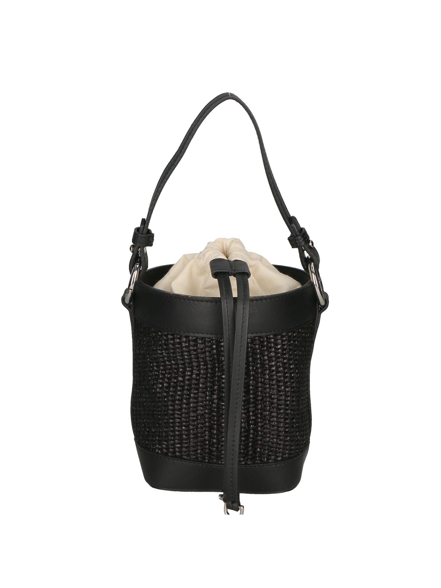 Diese Beuteltasche verfügt über eine gewebte Textur am Körper, ergänzt durch glatte Zierleisten und einen Kordelzugverschluss. Sie ist mit einem einzelnen oberen Griff zum Tragen ausgestattet.