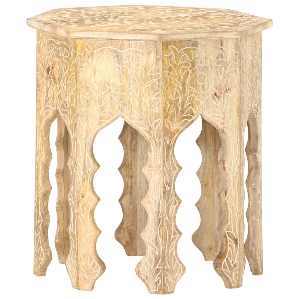 Massives Mangoholz ist ein tropisches Hartholz, das belastbar und verschleißfest ist. Die exquisite Handwerkskunst und die schönen Holzmaserungen machen jedes Stück zu einem Unikat. Die solide Tischplatte bietet eine stabile und sichere Oberfläche für die Platzierung Ihrer wichtigsten Dinge. Darüber hinaus trägt das handgeschnitzte Muster zu seiner Schönheit bei.