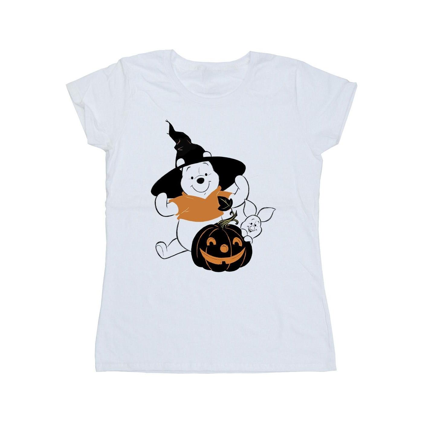 Dieses Halloween T-Shirt zeigt eine verspielte Grafik von Winnie-the-Pooh als Hexe, begleitet von Ferkel und einem geschnitzten Kürbis. Das Design fängt den festlichen Geist von Halloween mit beliebten Charakteren ein.