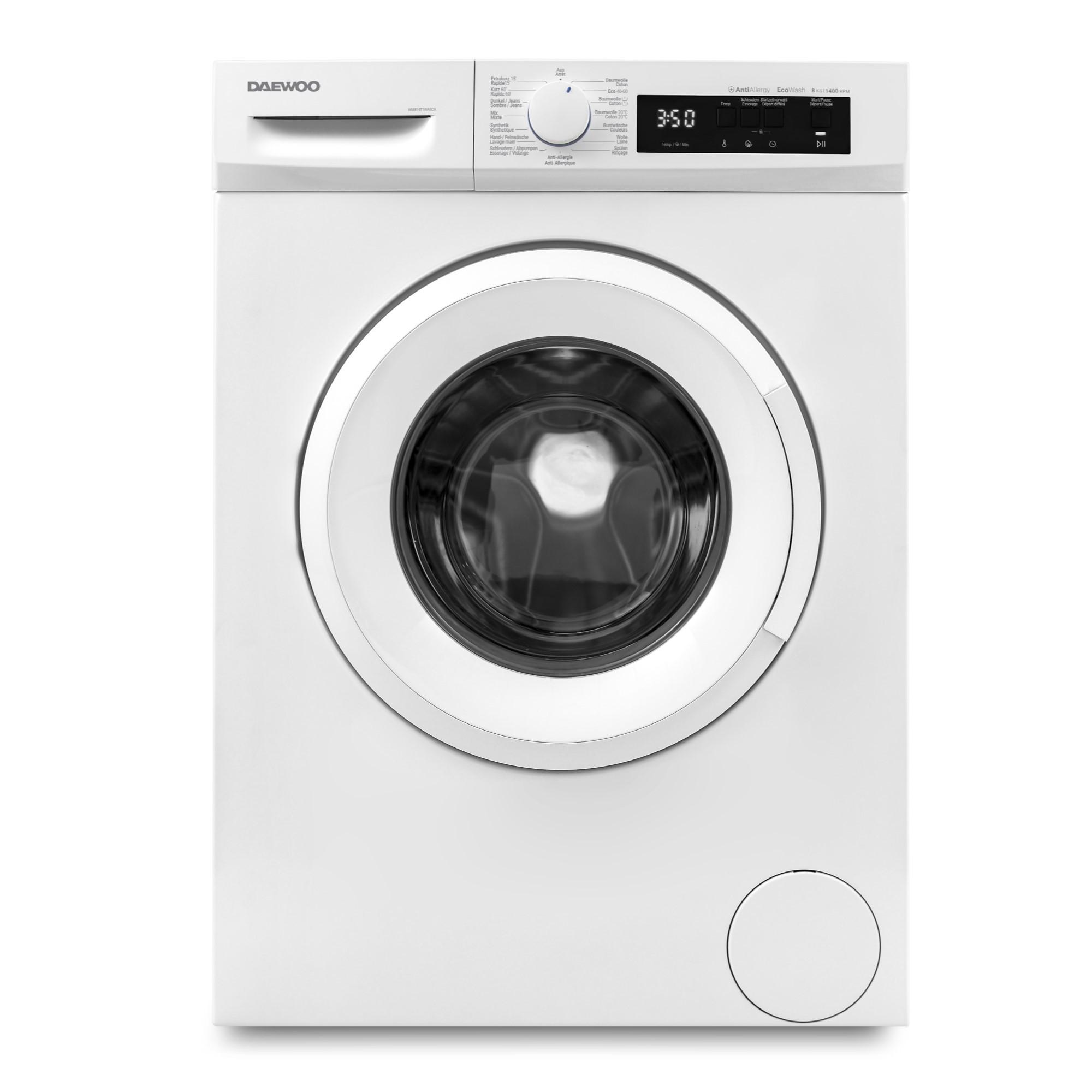 Die Waschmaschine WM814T1WA0CH von Daewoo ist ein hochwertiges Gerät mit einem Fassungsvermögen von 8 kg. Sie verfügt über eine Vielzahl von Funktionen, die das Waschen von Kleidung einfach und effizient machen.Ausstattung: LED-Display, Startzeitvorwahl, Aquastoppschlauch, Überlaufschutz, Restlaufanzeige & Kindersicherung15 Programme: Baumwolle, Baumwolle Vorwäsche, Buntwäsche, Baumwolle 20 °C, Eco 40-60 °C, Wolle, Spülen, Anti Allergie, Schleudern/Abpumpen, Hand und Feinwäsche, Synthetik, Mix, Dunkel und Jeans, Kurz 60, Extrakurz 15Fassungsvermögen: 8 kgSchleuderdrehzahl max.: 1400 U/minGerätemasse (HxBxT)/ 845x597x527 mmGewicht: 65.3 kgTüranschlag: links, nicht wechselbarTrommeltyp: EdelstahlEnergieeffizienzklasse: AEnergieverbrauch pro 100 Zyklen: 47 kWhDie Waschmaschine WM814T1WA0CH von Daewoo ist ein hochwertiges Gerät mit einem Fassungsvermögen von 8 kg. Sie verfügt über eine Vielzahl von Funktionen, die das Waschen von Kleidung einfach und effizient machen. Mit dem LED-Display haben Sie eine klare und benutzerfreundliche Anzeige, die Ihnen alle relevanten Informationen liefert.Die Startzeitvorwahl ermöglicht es Ihnen, den Waschvorgang im Voraus zu planen und die Maschine zu einem bestimmten Zeitpunkt automatisch zu starten. Dadurch haben Sie die Flexibilität, die Wäsche zu waschen, wenn es Ihnen am besten passt. Der Aquastoppschlauch sorgt für zusätzliche Sicherheit, da er im Falle eines Lecks den Wasserfluss stoppt und Wasserschäden verhindert.Ein Überlaufschutzmechanismus ist ebenfalls integriert, um das Risiko von Wasserschäden zu minimieren. Die Restlaufanzeige informiert Sie über die verbleibende Zeit des laufenden Waschprogramms, sodass Sie Ihre Aktivitäten entsprechend planen können. Mit der Kindersicherung können Sie die Tasten sperren und verhindern, dass Kinder unbeabsichtigt Einstellungen ändern.Die Waschmaschine bietet insgesamt 15 verschiedene Programme, darunter Baumwolle, Buntwäsche, Wolle, Synthetik und weitere. Sie können zwischen verschiedenen Temperaturen wählen, wie zum Beispiel Baumwolle bei 20 °C oder den energiesparenden Eco-Modus bei 40-60 °C. Es gibt auch spezielle Programme wie Anti-Allergie, Hand- und Feinwäsche sowie Kurz- und Extrakurzprogramme für schnelle Waschvorgänge.Die maximale Schleuderdrehzahl beträgt 1400 U/min, sodass Ihre Wäsche effektiv und gründlich geschleudert wird. Die Trommel besteht aus Edelstahl, was für eine schonende Behandlung Ihrer Kleidung sorgt und eine lange Lebensdauer gewährleistet.Die Abmessungen des Geräts betragen 845x597x527 mm, und es wiegt 65,3 kg. Der Türanschlag ist links und nicht wechselbar, daher sollten Sie den Standort der Waschmaschine entsprechend berücksichtigen. Die Waschmaschine gehört zur Energieeffizienzklasse A und verbraucht pro 100 Zyklen etwa 47 kWh Strom.Mit der Waschmaschine WM814T1WA0CH von Daewoo erhalten Sie ein leistungsstarkes Gerät mit einer Vielzahl von Funktionen und Programmen, das Ihnen das Waschen Ihrer Kleidung erleichtert. Mit einem grosszügigen Fassungsvermögen von 8 kg und einer hohen Schleuderdrehzahl erzielen Sie optimale Waschergebnisse. *Das Gerät ist für Einfamilienhaushalte vorgesehen, bei einer Anwendung in einem Mehrfamilienhaus und somit Überauslastung des Geräts, erlischt der Garantieanspruch.