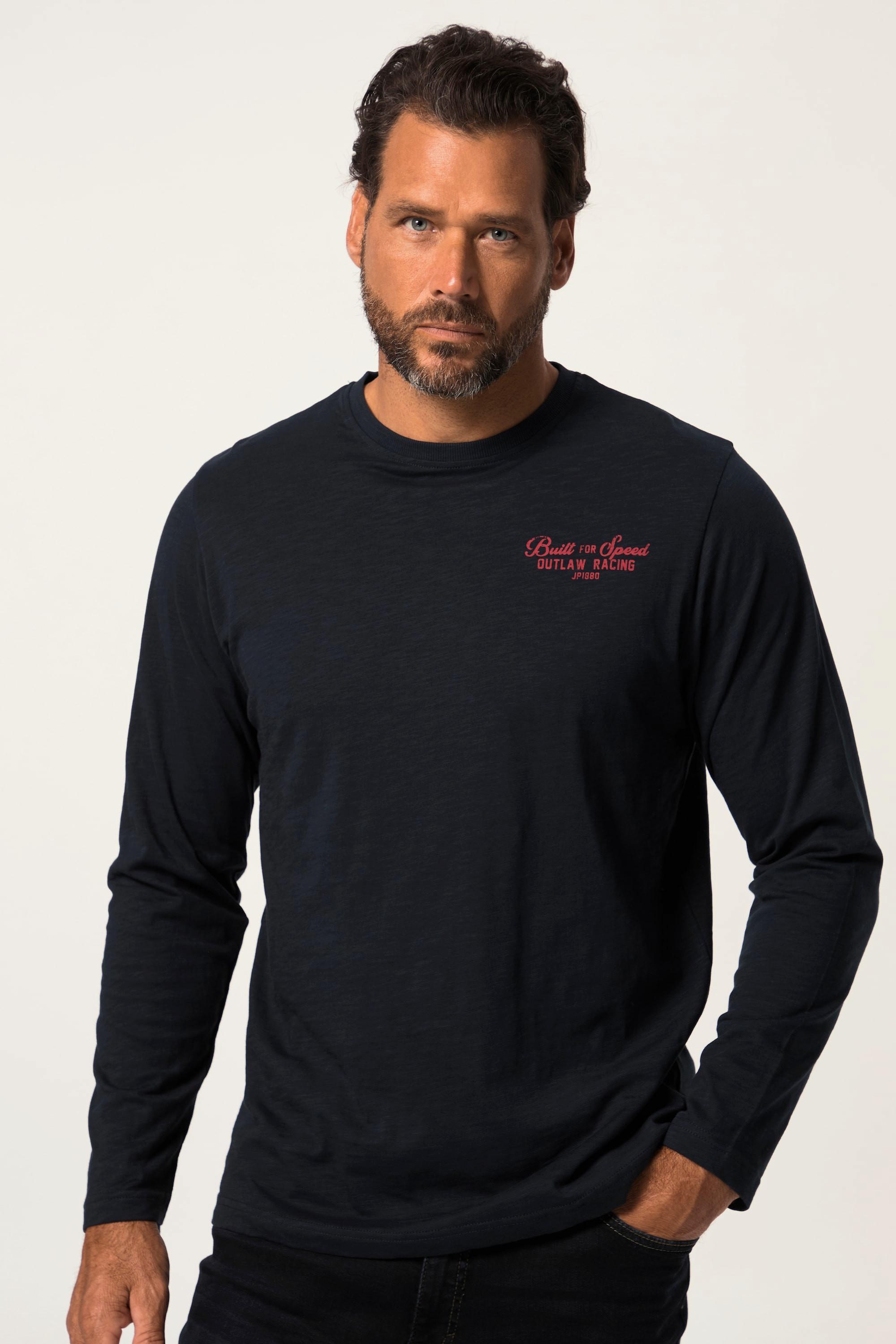 Dieses Langarmshirt verfügt über einen klassischen Rundhalsausschnitt und auffällige Prints auf der Vorder- und Rückseite. Das Design auf der Vorderseite enthält den Text "Built for Speed Outlaw Racing JP 1880", während die Rückseite eine grössere Grafik mit "Sprint Cars Outlaw Racing Built for Speed Knoxville Cult. US-Iowa" zeigt. Dieses T-Shirt kombiniert Komfort mit einem unverwechselbaren Stil und ist eine vielseitige Ergänzung für jede Freizeitgarderobe.