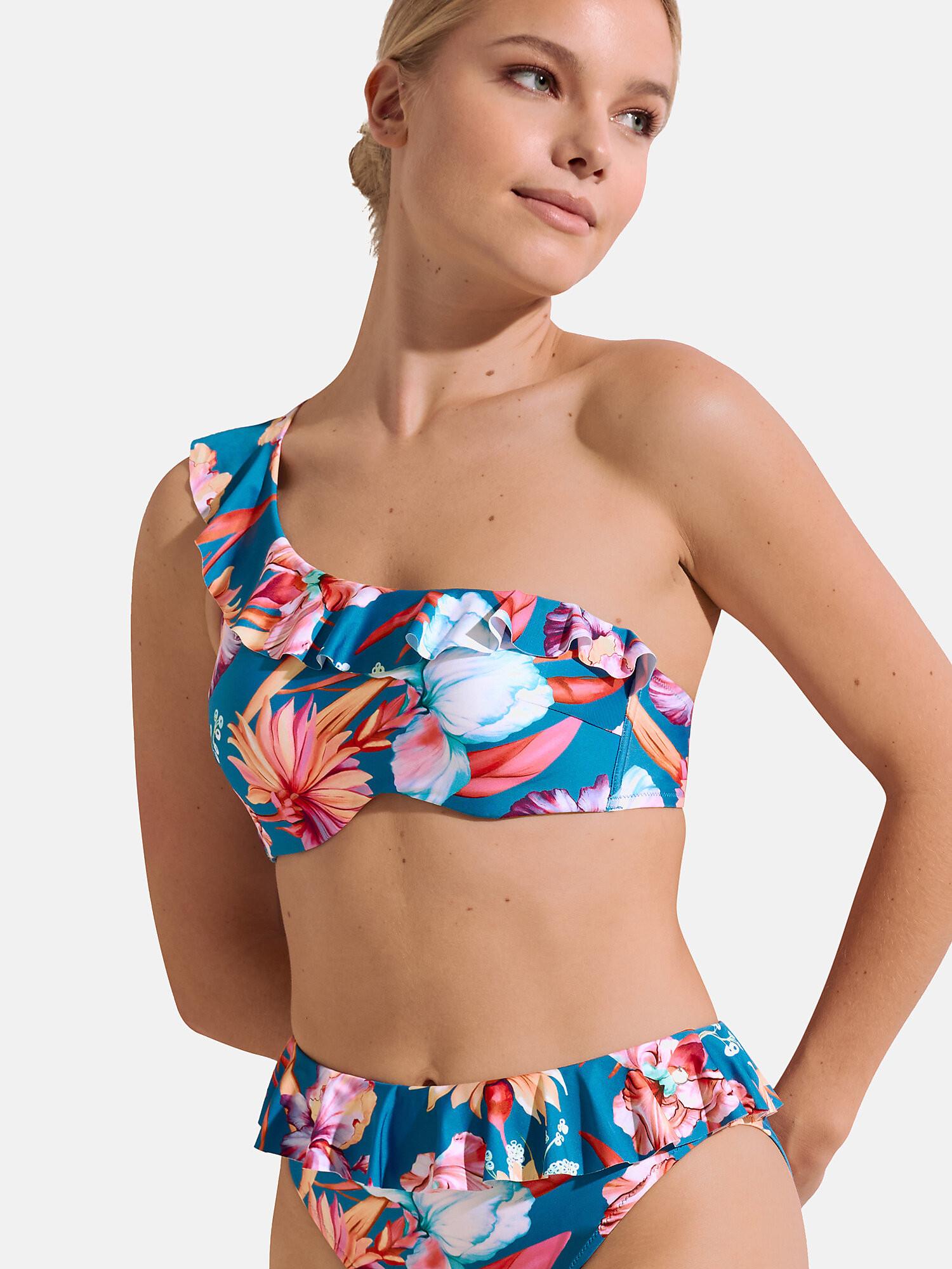Die kräftigen Farben des Drucks bilden die Grundlage dieser Kollektion, die von der Natur und Blumenmustern inspiriert ist. Das farbige Futter verleiht den Badeanzügen einen besonders verführerischen Effekt. Einige Stücke wirken durch ihre Rüschen besonders feminin und betonen bestimmte Körperpartien. Dieses Oberteil ist ideal für verschiedene Körperformen und Stylingwünsche und bietet optimalen Komfort und Wohlbefinden mit seinem floralen Print.