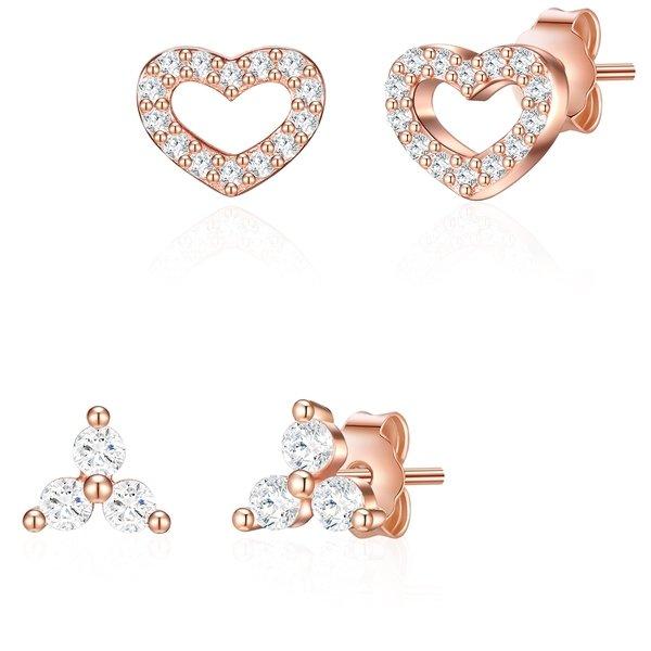 Geometrisch oder romantisch - aber auf jeden Fall mit einem Hauch Glitzer? Dieses Ohrstecker-Set des Labels Glanzstücke München bietet alles auf einmal. Heute ein funkelndes Herz in Cutout-Optik, morgen ein schlichtes Dreier-Ensemble aus Zirkonia: Fashionistas werden beide Designs lieben! Gefertigt aus 925 Sterlingsilber und mit einer Roségoldbeschichtung veredelt, bezaubert der feminine Glanz alle Fans der angesagten Goldnuance, im spannenden Kontrast zum kühlen Glamour der facettierten Zirkoniakristalle. Ob Casual, Business oder festlich: Die Ohrstecker-Paare haben das Zeug zum Every-Day-Piece und sind auch ein tolles Geschenk!