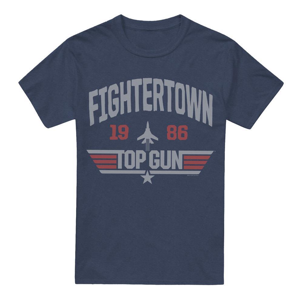 Dieses T-Shirt zeigt einen auffälligen "Fightertown 1986 Top Gun"-Grafikdruck auf der Vorderseite und ist somit ein herausragendes Stück für Fans. Das Design umfasst ein stilisiertes Flugzeug und einen Stern, die die ikonische Ästhetik des Films einfangen. Es ist offiziell lizenziert.