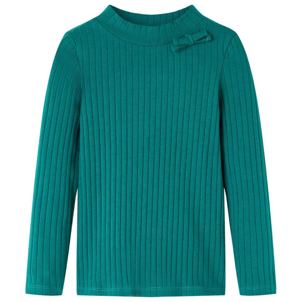 Dieses Kinder-T-Shirt mit Rippstrickmuster hat lange Ärmel, einen Halbrollkragen und eine gerade Passform. Das dunkelgrüne T-Shirt ist auch mit einer kleinen Schleife am Ausschnitt versehen. Das Langarmshirt ist aus weichem Material gefertigt, das zu 95 % aus Baumwolle und zu 5 % aus Elastan besteht und daher nicht nur äußerst komfortabel, sondern auch atmungsaktiv ist.