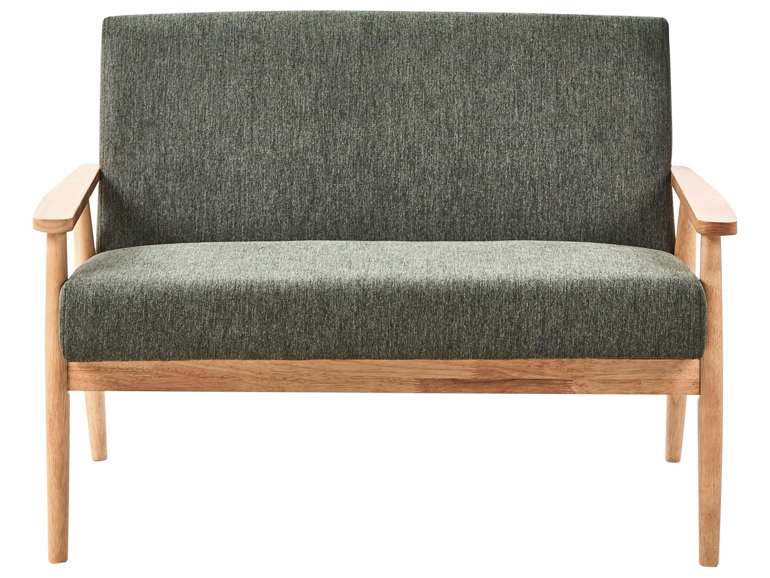 2-Sitzer Retro-Sofa mit Armlehnen aus Holz. Verwandeln Sie Ihr Zuhause mit diesem stilvollen und komfortablen Sofa. Bezogen mit angenehm weichem Stoff in Leinenoptik, bietet es einen gemütlichen Platz zum Entspannen. Der robuste Holzrahmen und die Armlehnen verleihen natürliche Wärme und unterstreichen den Mid-Century-Charme des Polstersofas. Ob im Wohnzimmer oder in einer Leseecke platziert – dieser Zweisitzer kombiniert Eleganz und Komfort.
