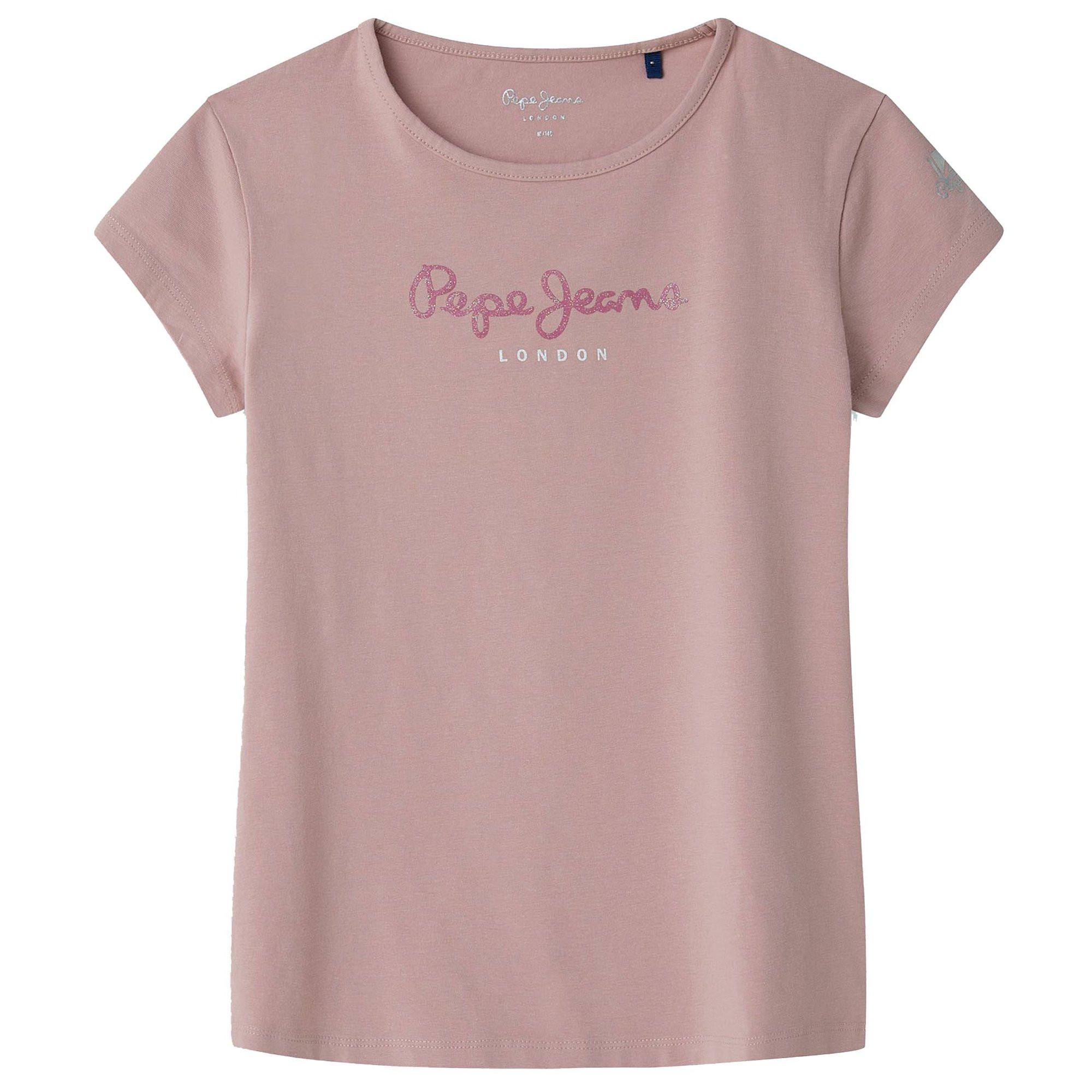 Einfarbiges T-Shirt für Mädchen von der Marke Pepe Jeans. Mit Rundhalsausschnitt und Logo-Print. Logo Schriftzug in Glitzer.