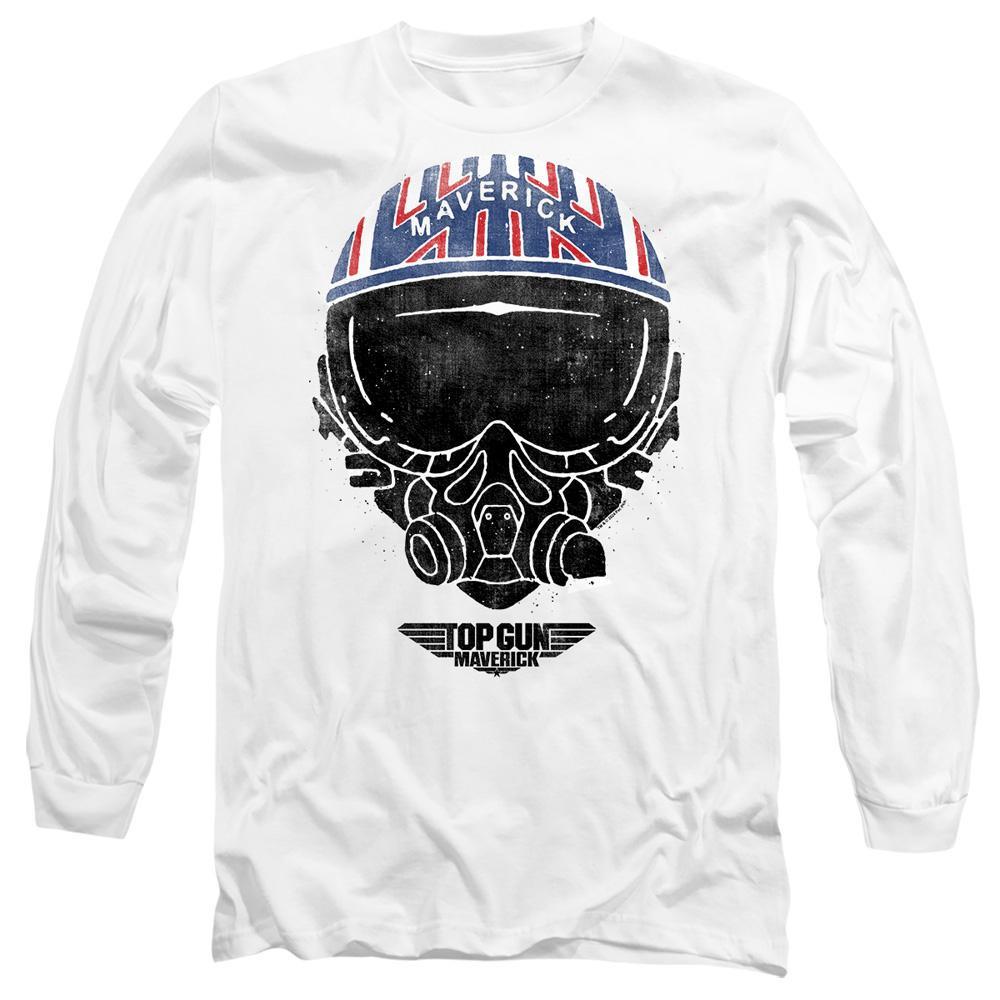 Dieses Langarm-T-Shirt verfügt über einen auffälligen Grafikdruck, der von Maverick inspiriert ist. Das Design zeigt einen Pilotenhelm mit der Aufschrift „Maverick“ oben, vor einem Used-Hintergrund für einen Vintage-Look. Unter dem Helm ist das ikonische „Top Gun Maverick“-Logo prominent platziert.