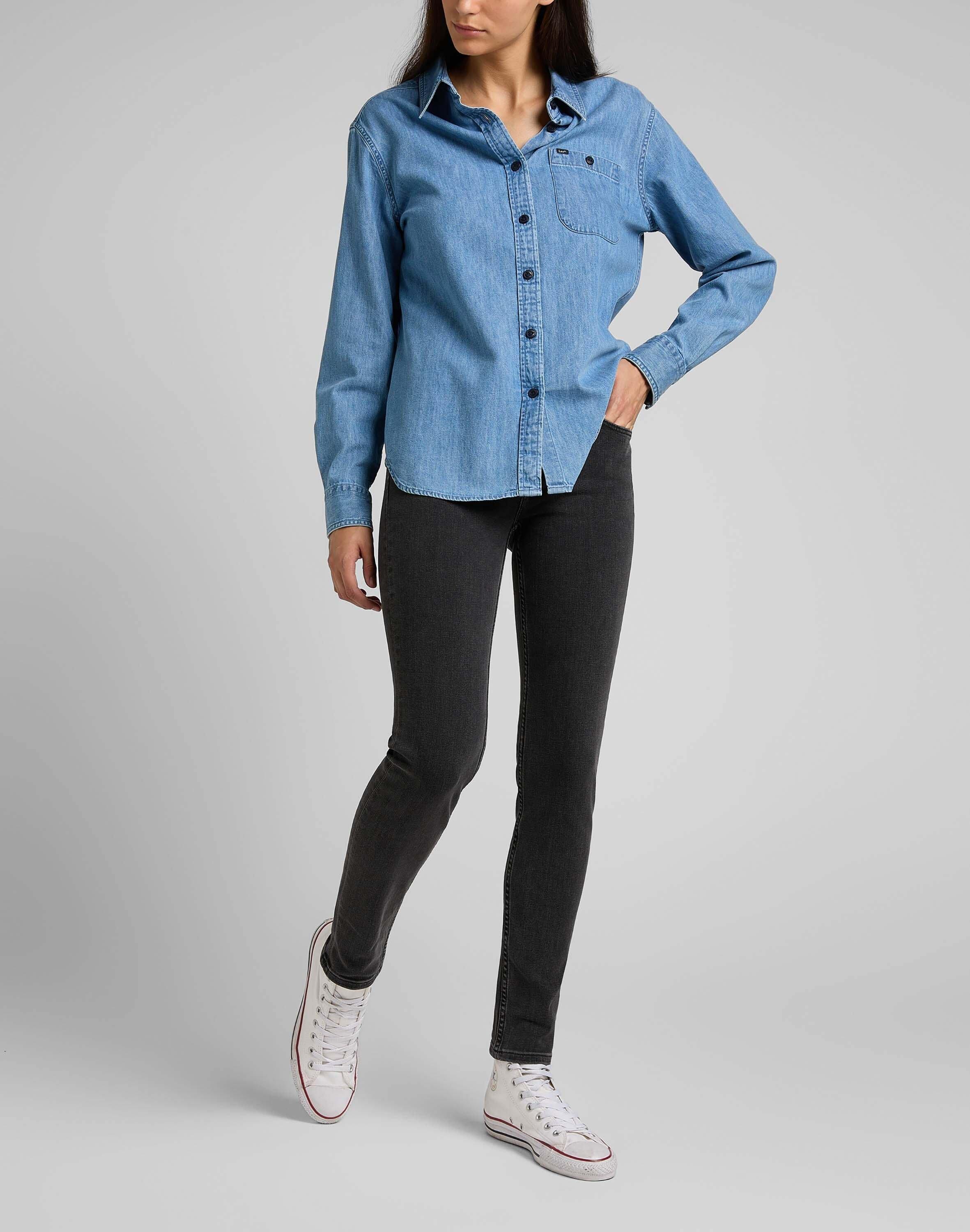 Das Finish ist ein stilvolles Tiefschwarz, nur dezent ausgewaschen, was dieser klassischen Skinny einen minimalistischen Look verleiht, der sowohl in der Freizeit als auch im Beruf oder am Abend gut zur Geltung kommt. Das schwarze Garn hält sie schlicht, während die silbernen Knöpfe und Nieten hervorstechen.