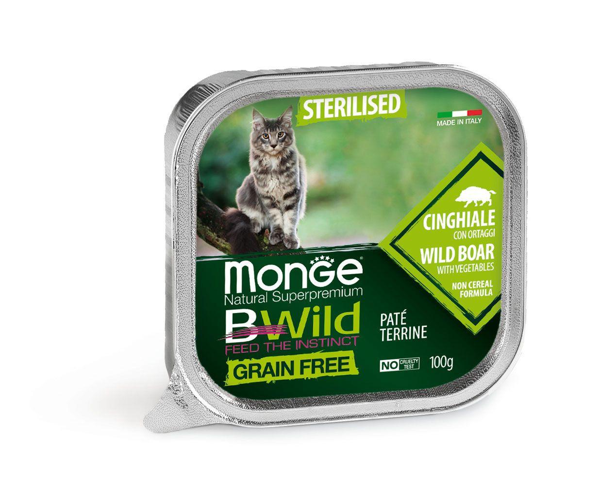 Monge Sterilized Wildkatze Wildschwein, Pastete 10x100g Monge Natural Super Premium Bwild getreidefreies Wildschwein mit Gemüse (grüne Bohnen und Karotten) ist ein vollwertiges und ausgewogenes Futter für kastrierte erwachsene Katzen. Speziell für das Wohlbefinden Ihrer kastrierten Katzen entwickelt, dank erhöhtem Ballaststoffgehalt und reduziertem Fettgehalt, um eine schlanke Figur zu erhalten. Die Formel ist mit Xylo-Oligosacchariden (XOS) angereichert, einer weiteren Generation von Präbiotika zur Unterstützung des Wohlbefindens des Darms. Es enthält Yucca schidigera, um den Fäkaliengeruch zu begrenzen.
