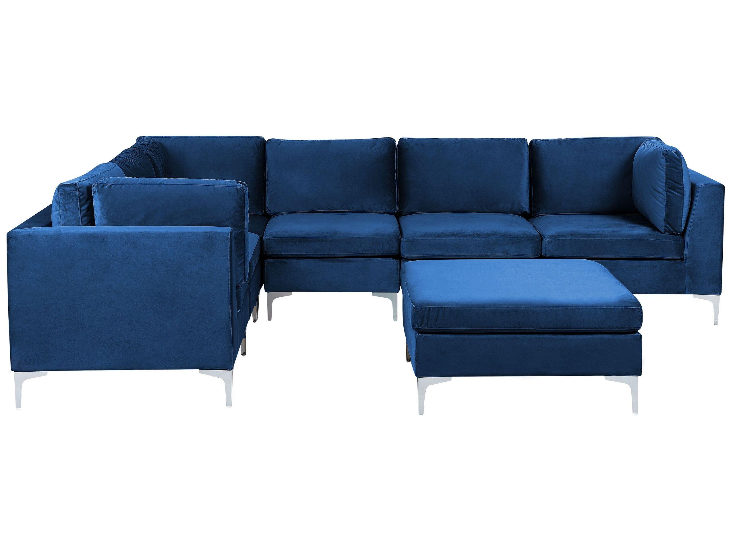 Klassisches, rechtsseitiges 6-Sitzer Sofa mit Fusshocker im trendigen Marineblau. Das Sofa besitzt einen hochwertigen Rundumbezug aus Samtstoff, sowie abnehmbare Kissenbezüge, weshalb es auch für Familien mit Kleinkindern oder Tierliebhaber eine gute Wahl sein kann. Die trendige Farbgebung in Marineblau korrespondiert ausgezeichnet mit den verchromten Metallbeinen in Silberoptik, weshalb es äusserst modern, edel und einladend wirkt. Die Eck- und Mittelsücke können als selbstständige Möbel oder als Modulelemente eines Ecksofas oder einer grösseren Wohnlandschaft dienen. Den Puf kann man als Abstellfläche für Zeitschriften oder Kaffeetassen, zusätzlichen Sitzplatz oder Fusshocker nutzen.