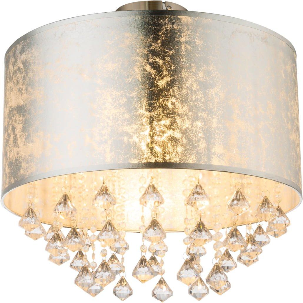 Diese Deckenleuchte der Amy I Serie ist mit 40cm Durchmesser für viele Raumgrössen geeignet. Der silberfarbene Textilschirm hat ein metallisches Finish und bekommt durch die unterschiedlichen Transparenzen zusätzlichen Glanz. Der dichte Behang aus Acrylkristallen bricht das Licht und erzeugt kleine Regenbögen an Decke und Wänden. Die Leuchte verfügt über eine E27 Fassung. Das Leuchtmittel ist im Lieferumfang nicht enthalten.