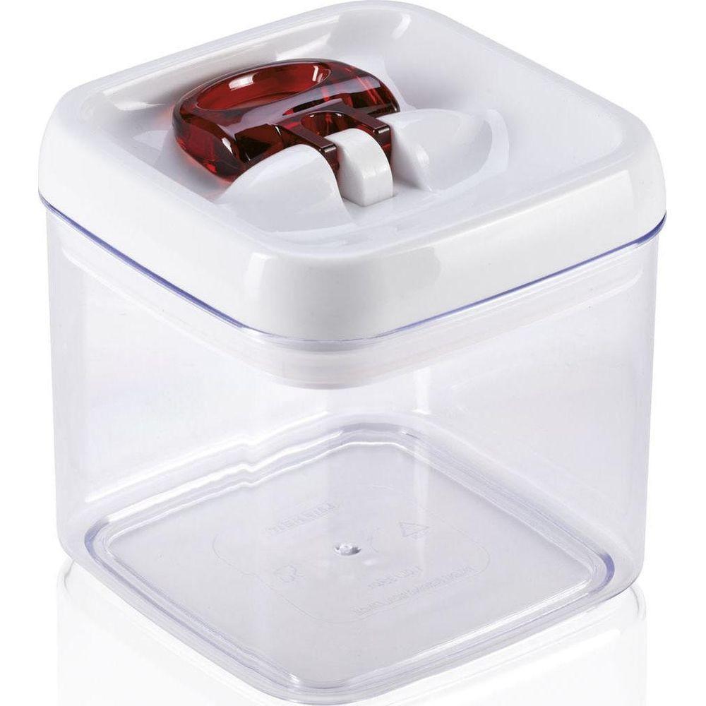 eckig, aus transparentem Kunststoff, mit der genialen Verschlusstechnik werden alle Behälter mit nur einer Hand kinderleicht luft- und wasserdicht verschlossen und geöffnet, Deckel weiss, die Dosen