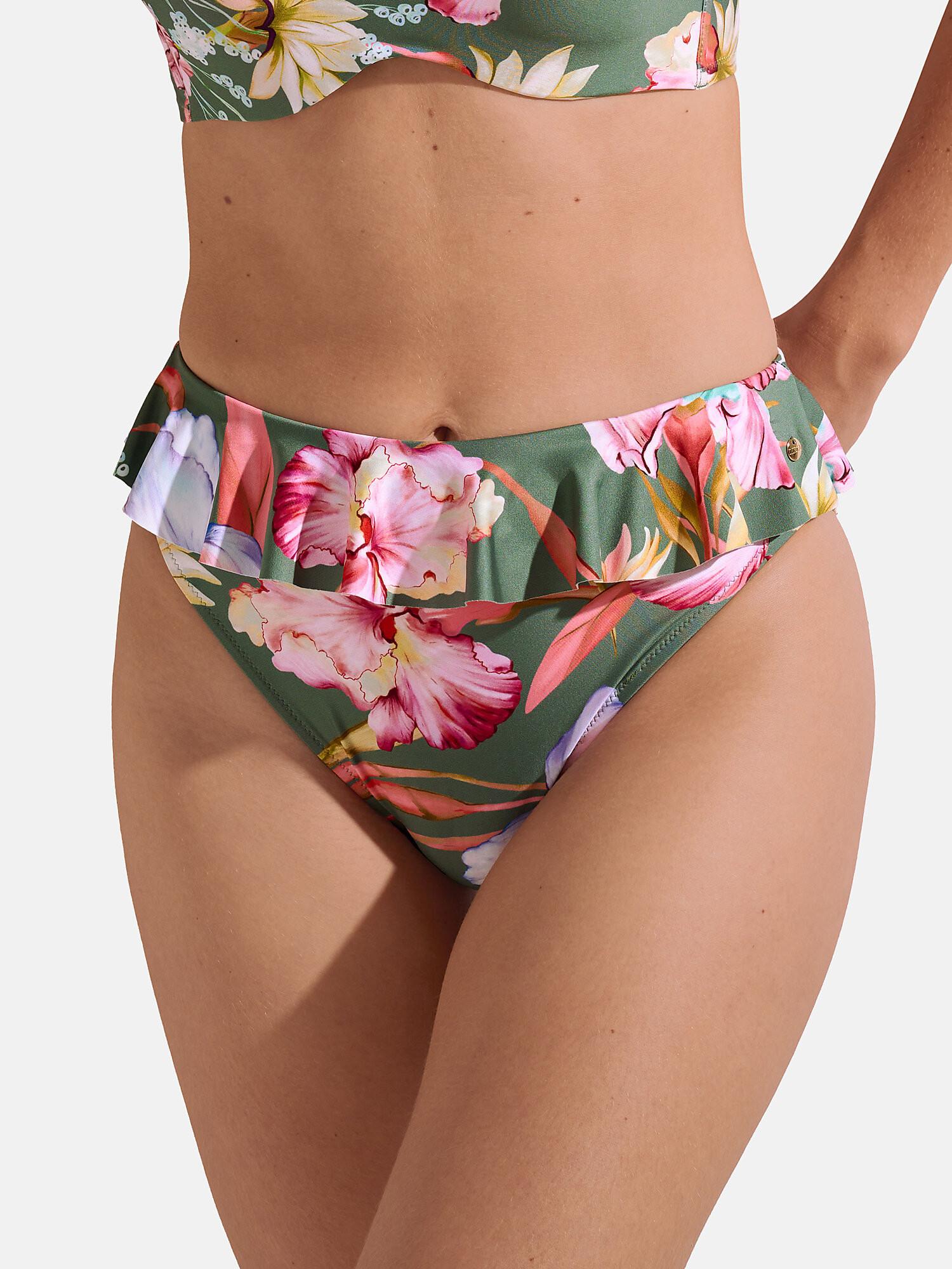Die Rimini Kollektion High Waist High Cut Bikinihose von Lisca. Diese moderne Bikinihose verfügt über eine hohe Taille und einen hohen Beinausschnitt. Rüschen an der Taille beleben das Stück und verleihen ihm einen romantischen Look. Die Vorder- und Rückseite sind mit einem farbigen Futter versehen.