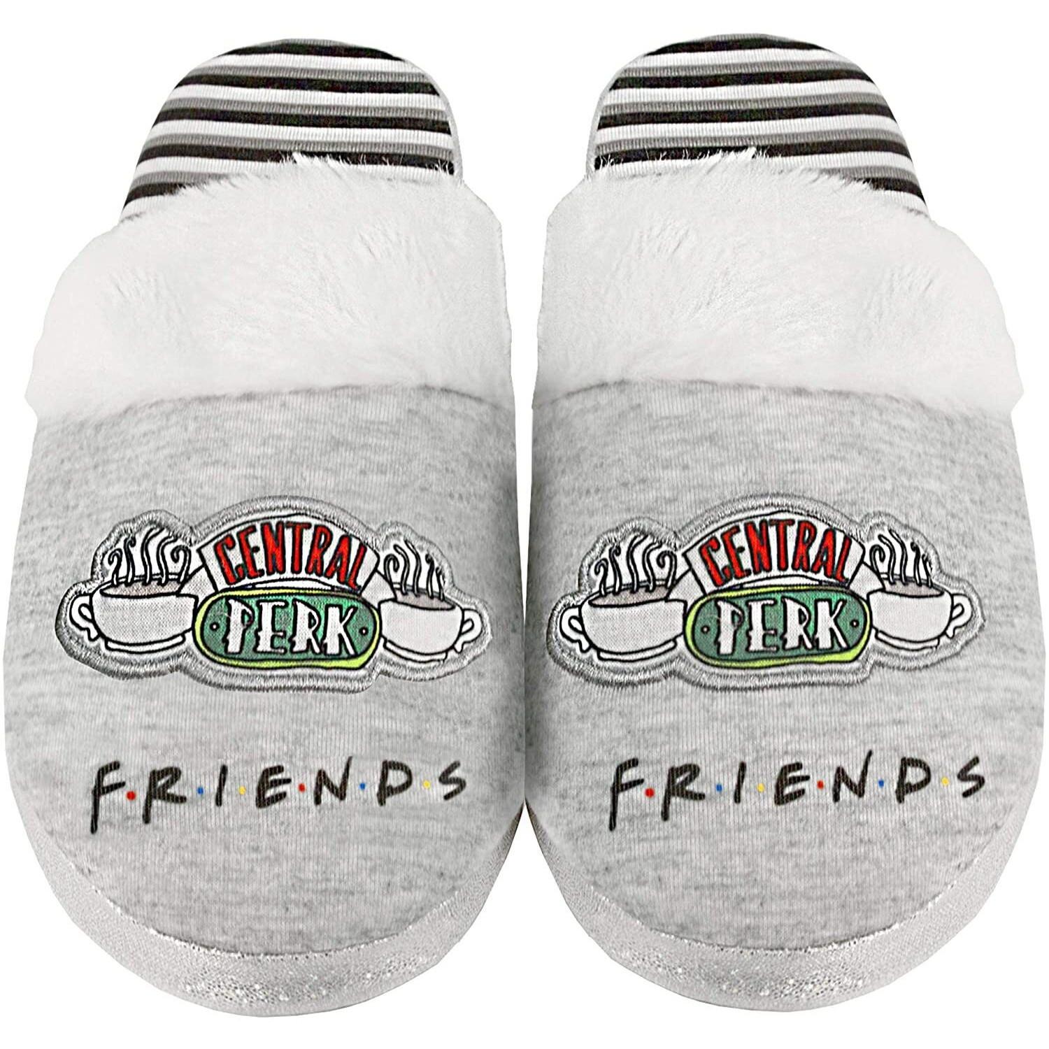 Marke: Friends. Obermaterial: Polyester. Einlegesohle: Kontraststreifen. Laufsohle: Mit Silikon-Noppen, Gummi. Kragen aus Kunstpelz, Offene Ferse. Absatz: Flach. Design: Central Perk, Logo. Zehenstil: Rund. 100% offiziell lizenziert. Sohle: Glitzer. Zum Anschlüpfen.