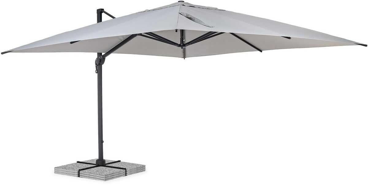 Sonnenschirm/Ampelschirm mit Gestell aus Aluminium mit Pulverbeschichtung (Polyester). Mast 93x57mm. 8 Streben 28x18mm. Tuch hellgrau aus Polyester 250g/m2 mit Beschichtung aus PA (Polyamid). Stahl-Standkreuz. Mast schwenkbar um 360° mit Pedal. Vertikale Neigung mit Griff mit 4 Positionen verstellbar. Mit Schutzhülle. Gewichte für Schirmständer nicht inbegriffen. Es sind mindestens 8 Gewichte in der Grösse 50x50 erforderlich (160 / 200 kg).Ausgelegt auf Led-Leuchte Artikelnummer 795364 und Lautsprecher Artikelnummer 795365.