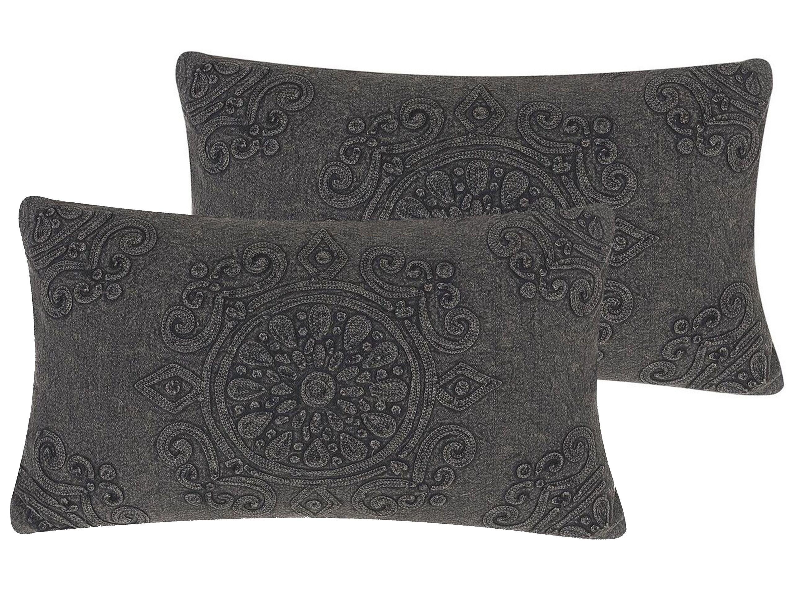 Boho-Dekokissen im praktischen 2er-Set. Die dunkelgrauen hochwertigen Dekokissen begeistern mit dem Boho-Design, das vom Mandala-Muster inspiriert ist. Dank den gravierten dekorativen Motiven verleiht dieses Kissen-Set jedem Innenraum eine gemütliche Atmosphäre – ein Must-have, wenn Sie nach einzigartigen Wohnaccessoires suchen.