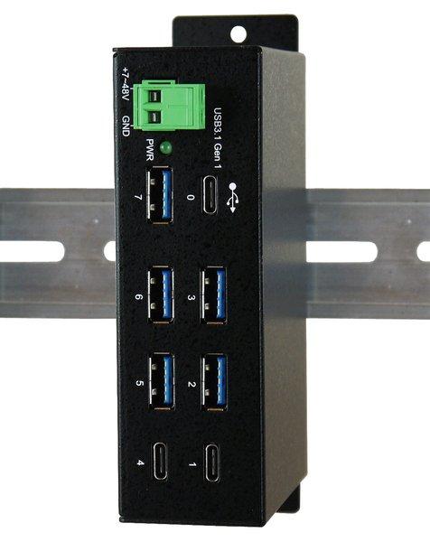 Der EX-1196HMS ist ein USB 3.0/3.1(Gen1) Metall HUB der den Spezifikationen des Universal Serial Bus (USB) Revision 3.1(Gen1) entspricht und mit einer Datengeschwindigkeit bis zu 5Gbps arbeitet. Er bietet einen USB-C-Upstream Port und 7 Downstream-Ports mit 15KV ESD Überspannungsschutz für jeden Port. Port 1+4 ist mit einer neuen C-Buchse ausgestattet. Es ist somit möglich bis zu sieben externe USB Peripheriegeräte an einen USB 3.0 Port vom Rechner im 19" Rack anzuschliessen. Er kann in Automatisierung– und Büroanwendungen verwendet werden. Der HUB erfüllt die speziellen Anforderungen von Industrieanwendungen.