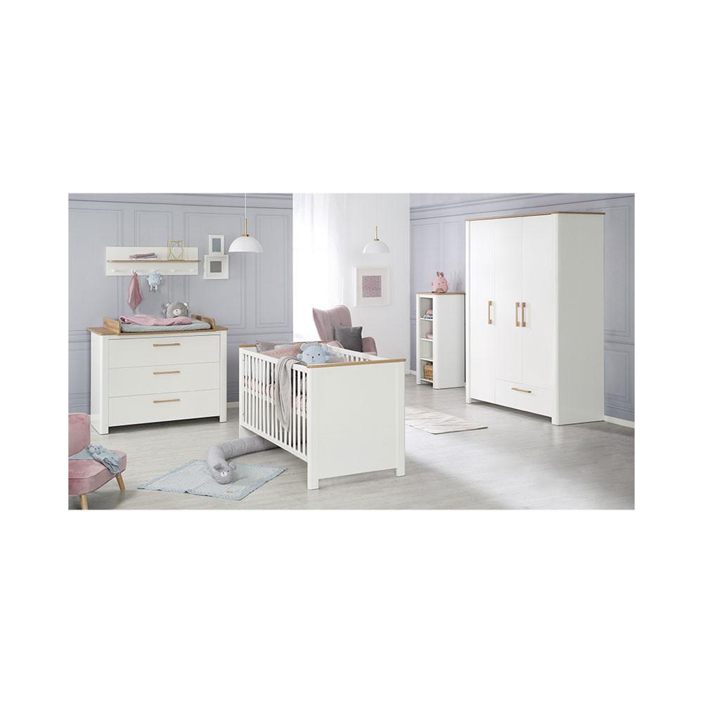 Das roba komplett Babyzimmer Ava ist die perfekte Lösung für dein Babyzimmer. Mit dem Kombibett (70x140 cm), der breiten Wickelkommode, einem dreitürigen Kleiderschrank mit Soft-Close-Funktion und die Wandgarderobe bietet dieses Set Stil und Funktionalität. Das weisse Design mit Akzenten in Artisan Oak bringt eine moderne und warme Atmosphäre ins Kinderzimmer. Das Bett kann in ein Juniorbett umgewandelt werden und wächst somit mit deinem Kind mit. Die Wickelkommode ist rückenfreundlich hoch und kann später als einfache Kommode genutzt werden, wenn dein Kind wächst.