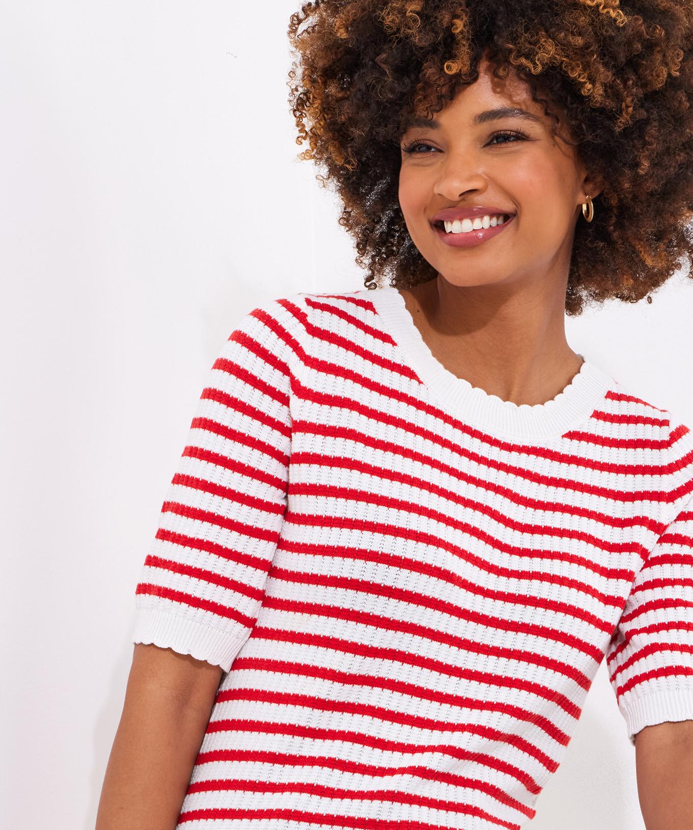 Dieses gestreifte Strick-T-Shirt ist eine klassische und vielseitige Ergänzung für jede Garderobe. Das Design verfügt über einen Rundhalsausschnitt mit einer zarten Wellenkante, die einen Hauch von Eleganz verleiht. Die kurzen Ärmel haben ebenfalls einen passenden Wellensaum, der die Gesamtästhetik verbessert. Die horizontalen Streifen bieten ein zeitloses Muster, das dieses Oberteil für verschiedene Anlässe geeignet macht.