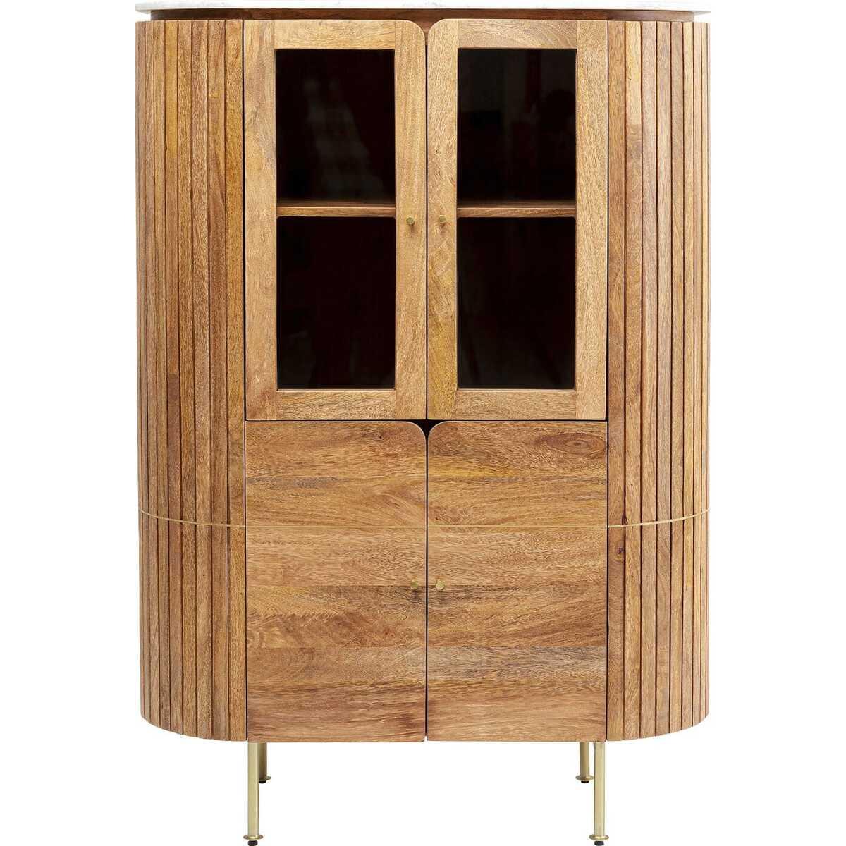 Modern, edel und mit einer Prise Luxus: dieser Schrank bringt Ihren Wohnbereich auf das nächste Level in puncto Interieur. Die Kombination der verarbeiteten Materialien ist ein Spektakel für sich. Das Wohnzimmer-Möbel aus massivem Mango-Holz mit hochwertiger Marmor-Platte und goldenen Beinen strotzt nur so vor Stilsicherheit. Die ovale Form gibt dem Ganzen zusätzlich den letzten Schliff. Nicht ohne Grund ist der Vitrinenschrank ein Einzelstück dank seiner handgearbeiteten Fertigung und setzt Ihre Weingläser, Flaschen und Dekoideen perfekt in Szene. In der Küche, im Wohnzimmer oder Esszimmer: der Schrank ist ein Allrounder und bietet durch zwei Türen und vier Fächer ausreichend Platz - zudem sind die Scharniere justierbar.Aussergewöhnlicher Holz-Schrank mit Glas-VitrineErstklassiges Design mit hochwertigen Materialien wie Massiv-Holz und echtem MarmorVitrinenschrank und Stauraum-Wunder mit vier grossen FächernDie Zierleisten auf beiden Seiten und die abgerundete Form des Schranks sorgen für UniquenessHandgearbeitetes Einzelstück mit Design-CharakterProduktinformation Korpus: Mango Massivholz gebeizt-lackiert, Abdeckplatte: Marmor, Front: Mango Massivholz gebeizt-lackiert, Rückwand: mitteldichte Faserplatte lackiert, Fuss/Füsse: Stahl pulverbeschichtet (galvanisiert), Fachboden: Mango Massivholz gebeizt-lackiert, 40 kg max. Belastbarkeit, handgearbeitet, Bodengleiter: höhenverstellbar, Scharniere justierbar, teilzerlegt