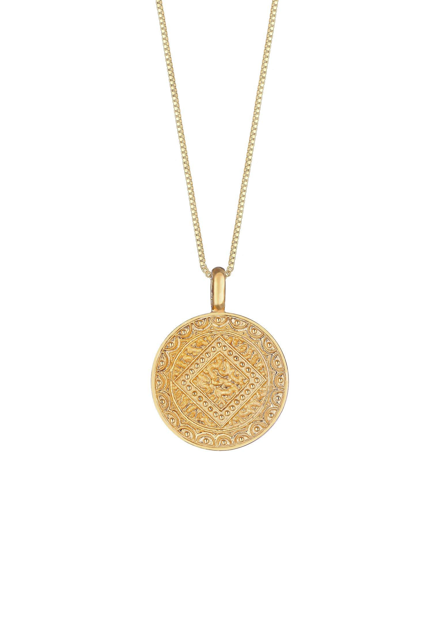 Diese 60 cm lange Plättchen Damen Halskette wurde aus feinstem, vergoldeten 925 Sterling Silber handgefertigt und ist das neue It-Piece in jeder Schmucksammlung. Das moderne Design der Box Chain ist ein Must-Have für alle modebewussten Frauen, die Fashion lieben. Der Ornament-Anhänger der Kette überzeugt durch seinen Vintage Look. Auch für einen modischen Lagenlook eignet sich dieser moderne, vergoldete Silberschmuck ideal. Eine tolle Ergänzung für jedes Schmuckkästchen.