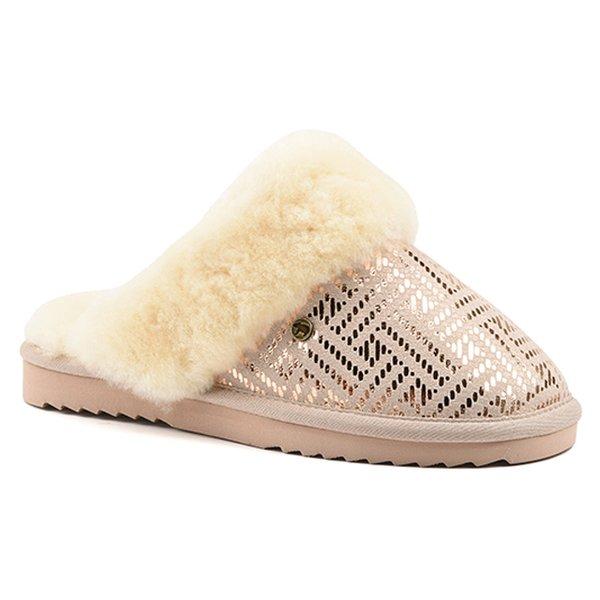 Diese Hausschuhe wurden entwickelt, um den Füssen Wärme und Weichheit zu verleihen. Ihr Obermaterial aus Wildleder bietet eine seidige Textur, während das Futter aus Schaffell für eine optimale Isolierung sorgt. Die Schafspelz-Innensohle verleiht einen zusätzlichen Hauch von Komfort. Die synthetische Laufsohle bietet aussergewöhnliche Festigkeit und Haltbarkeit. Zu den Details gehört ein Samt-Leder-Mule, der einen Hauch von Raffinesse hinzufügt. Die goldfarbene Farbe unterstreicht die Eleganz dieser Schuhe. Entworfen für Entspannung und Winter, sind diese Hausschuhe ideal für eine angenehme Zeit zu Hause.