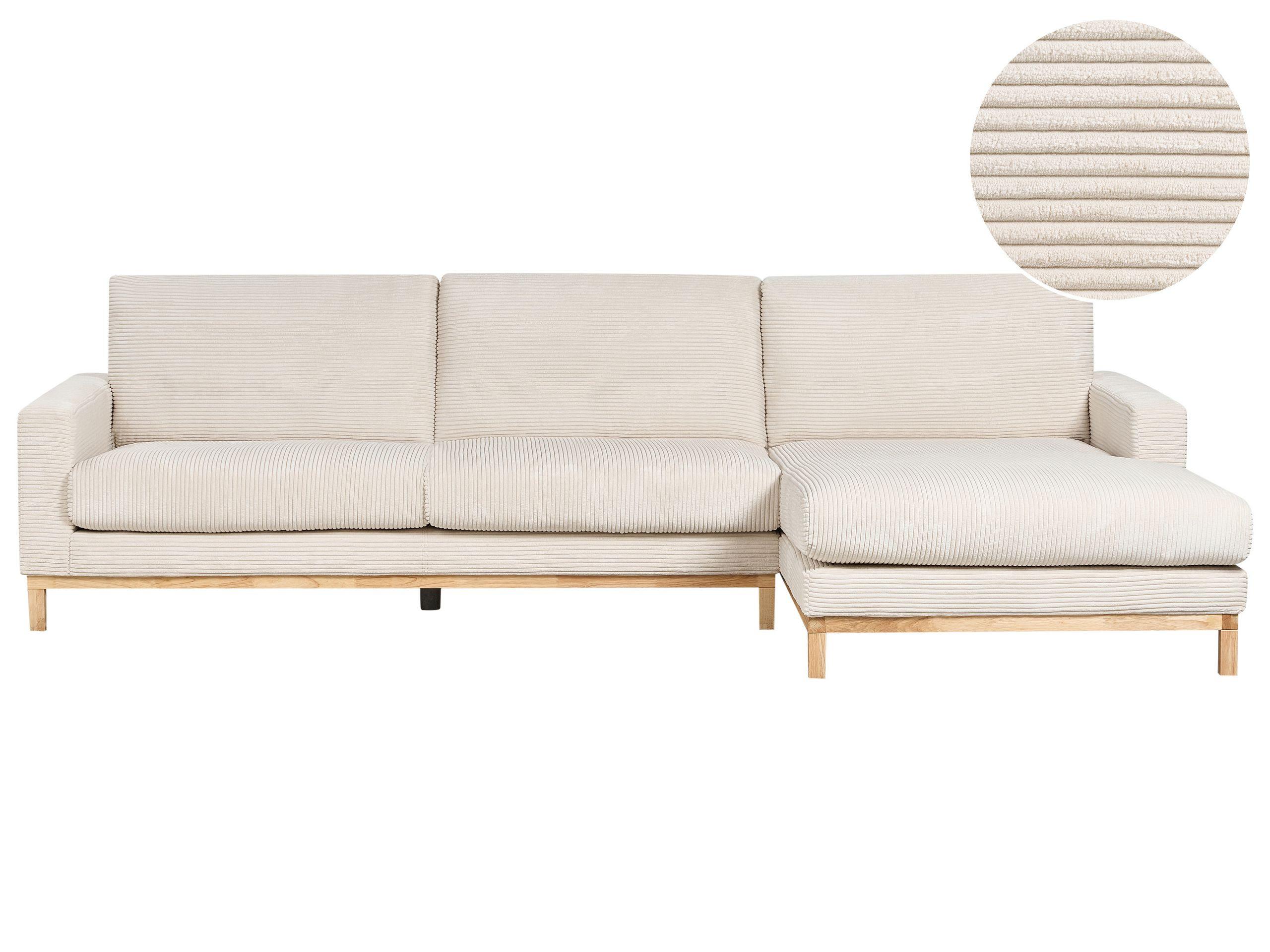 Linksseitiges 4-Sitzer Polstersofa mit weichem Cord-Bezug. Entdecken Sie ein Ecksofa, das nicht nur Gemütlichkeit ausstrahlt, sondern diese auch verkörpert. Dieses Polstersofa zeichnet sich durch seine angenehm weichen, dicken Sitz- und Rückenkissen aus, die zusammen mit den breiten Armlehnen und der robusten Holzkonstruktion einen perfekten Sitzkomfort versprechen. Das helle Holzgestell sorgt nicht nur für Robustheit, sondern hebt auch die stilvolle Silhouette des Sofas und den hellen Farbton des kuscheligen Cord-Bezugs hervor. Die abnehmbaren Kissenbezüge garantieren Pflegeleichtigkeit, während die seitlichen, dicken Holzbeine eine angemessene Stabilität bieten.